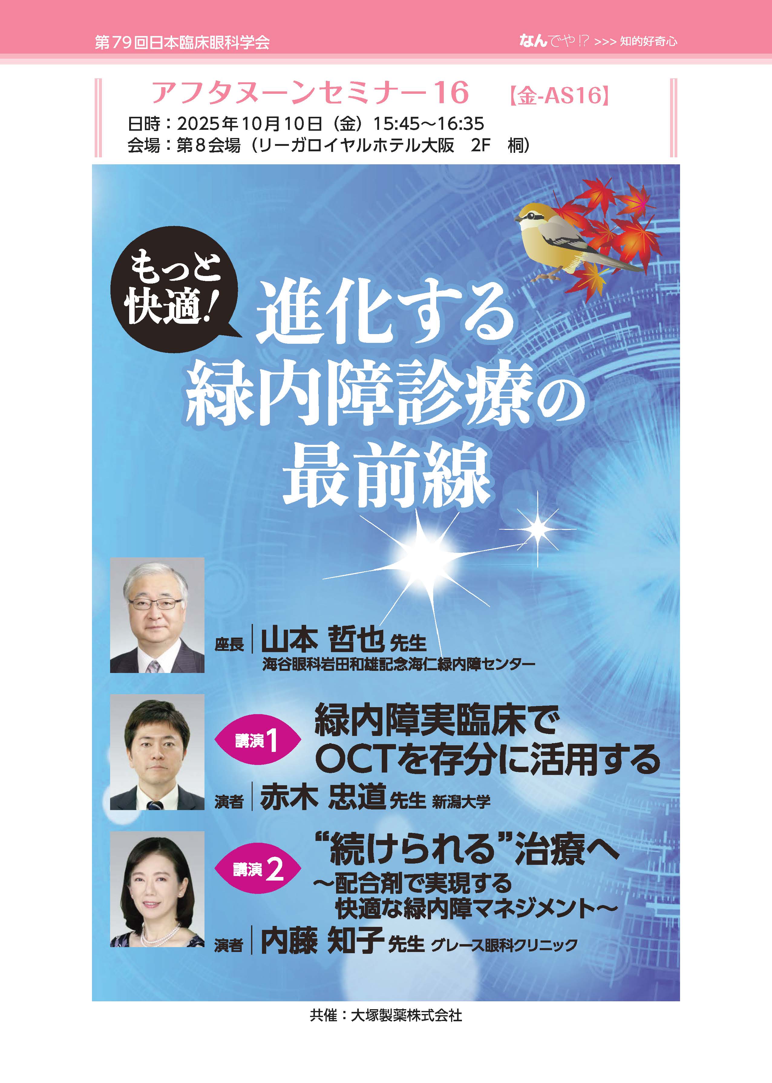 アフタヌーンセミナー 16 もっと快適!進化する緑内障診療の最前線 2025年10月10日(金) 15:45 - 16:35 第8会場 | リーガロイヤルホテル大阪 2F 桐 共催:大塚製薬株式会社 |