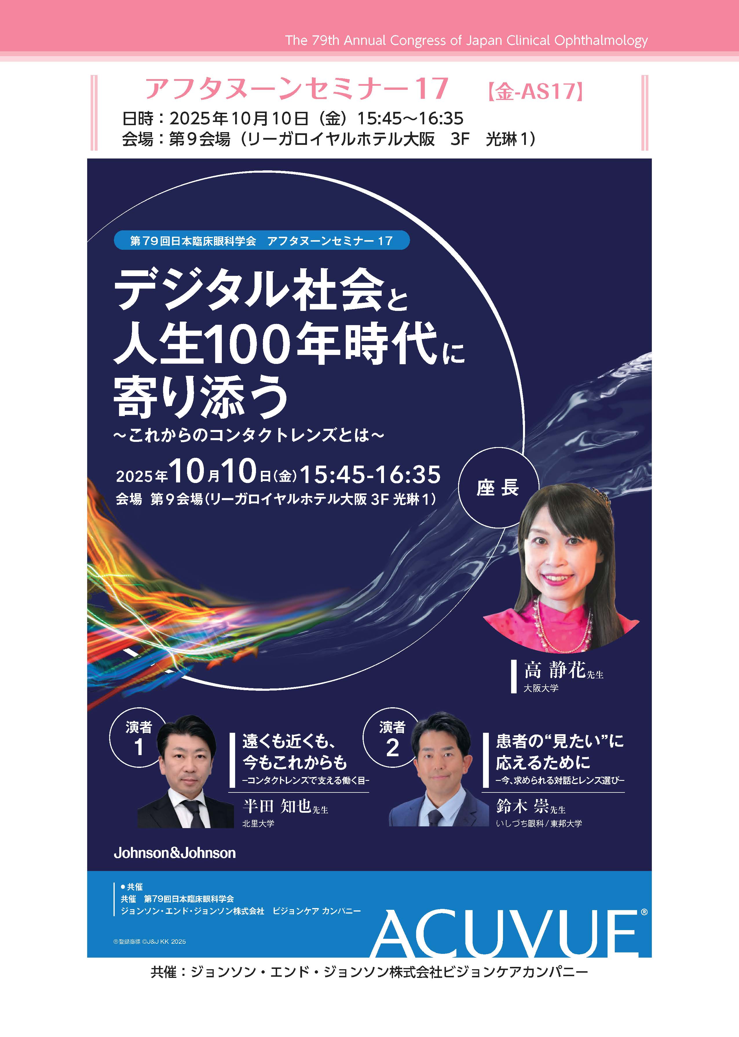 アフタヌーンセミナー 17 デジタル社会と人生100年時代に寄り添う ~これからのコンタクトレンズとは~ 2025年10月10日(金) 15:45 - 16:35 第9会場 | リーガロイヤルホテル大阪 3F 光琳1 共催:ジョンソン・エンド・ジョンソン株式会社ビジョンケアカンパニー |