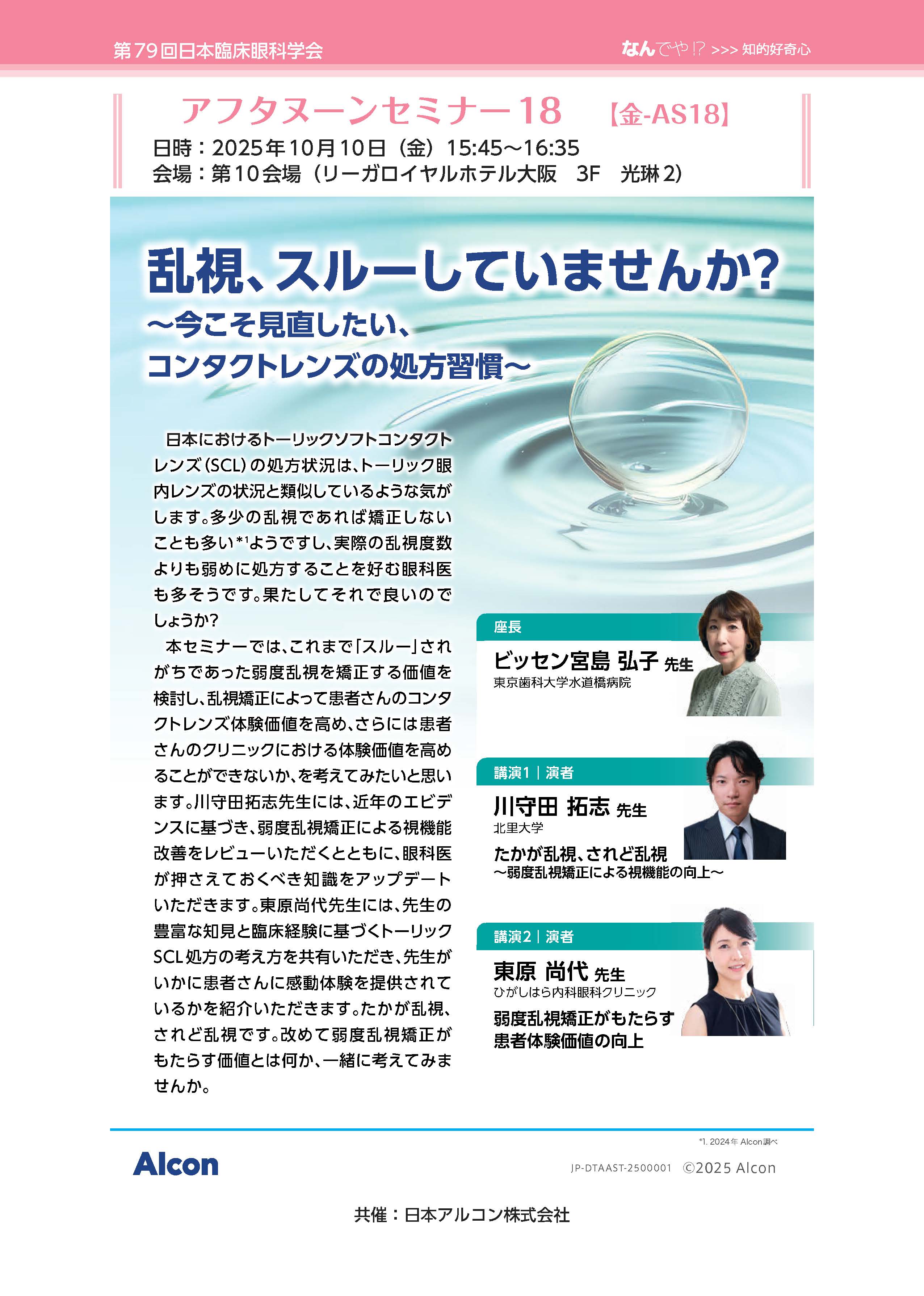 アフタヌーンセミナー 18 乱視、スルーしていませんか? ~今こそ見直したい、コンタクトレンズの処方習慣~ 2025年10月10日(金) 15:45 - 16:35 第10会場 | リーガロイヤルホテル大阪 3F 光琳2 共催:日本アルコン株式会社 |