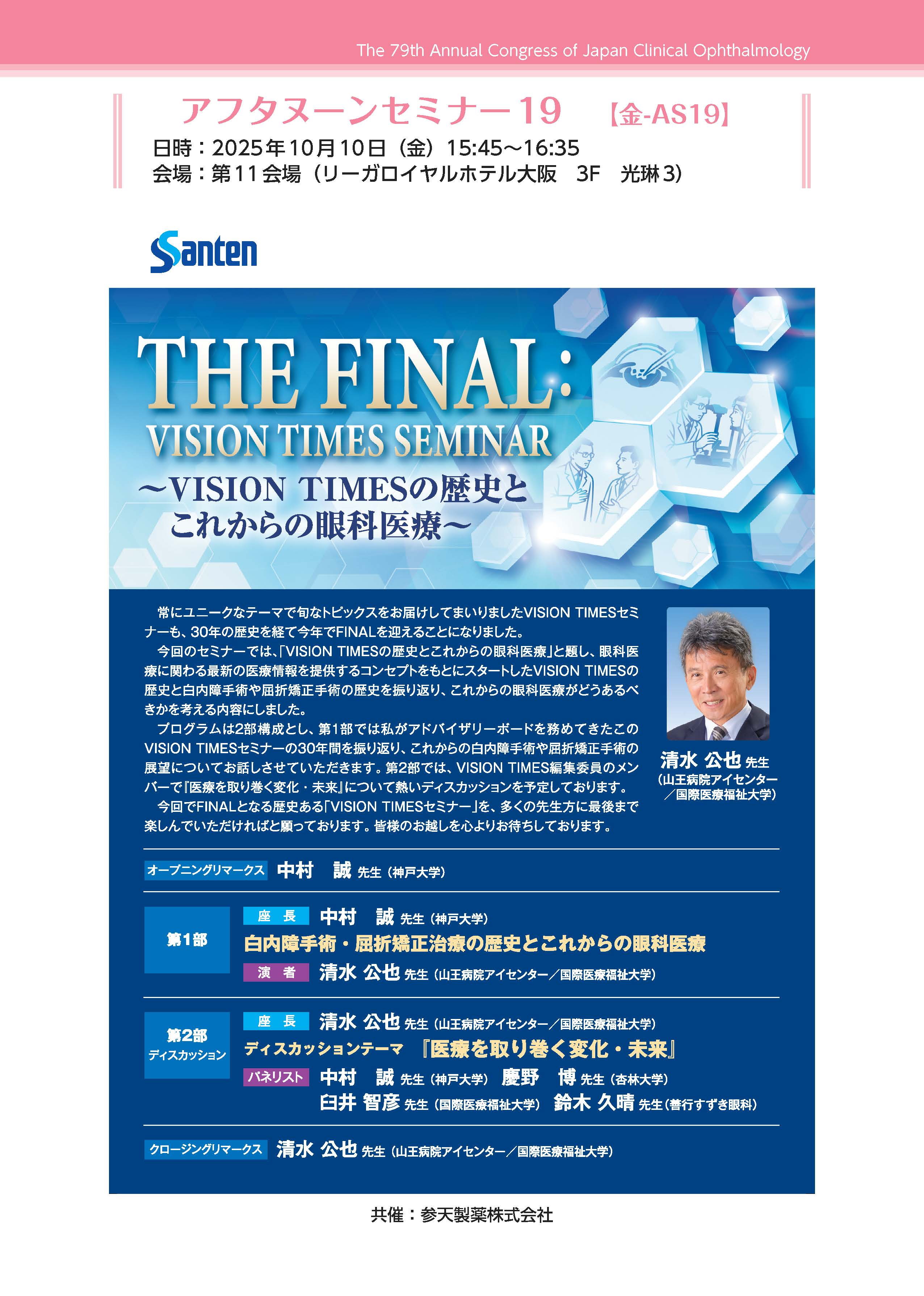 アフタヌーンセミナー 19 THE FINAL:VISION TIMES SEMINAR~VISION TIMESの歴史とこれからの眼科医療~ 2025年10月10日(金) 15:45 - 16:35 第11会場 | リーガロイヤルホテル大阪 3F 光琳3 共催:参天製薬株式会社 |