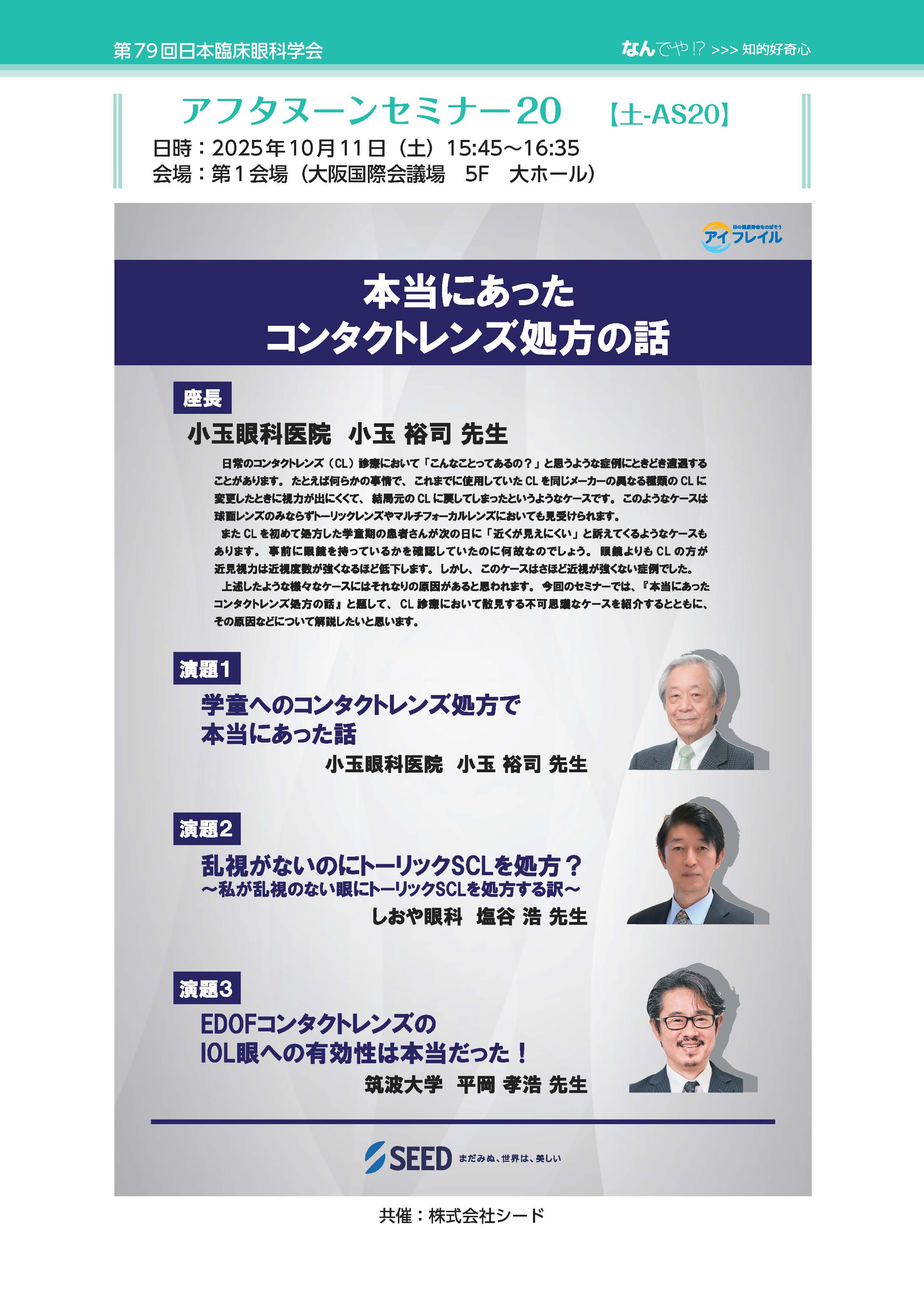 アフタヌーンセミナー 20 本当にあったコンタクトレンズ処方の話 2025年10月11日(土) 15:45 - 16:35 第1会場 | 大阪国際会議場 5F 大ホール 共催:株式会社シード |
