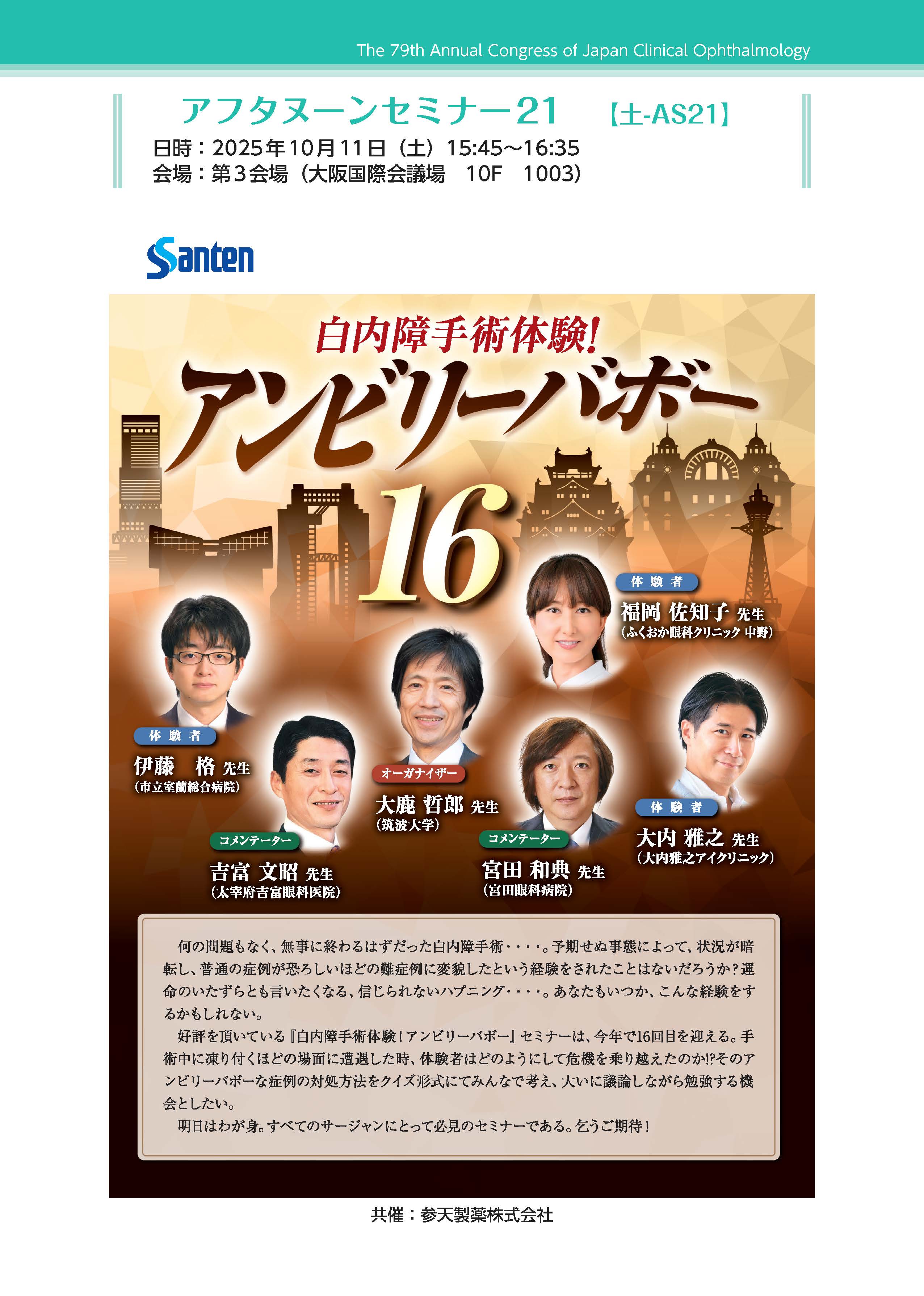 アフタヌーンセミナー 21 白内障手術体験!アンビリーバボー16 2025年10月11日(土) 15:45 - 16:35 第3会場 | 大阪国際会議場 10F 1003 共催:参天製薬株式会社 |