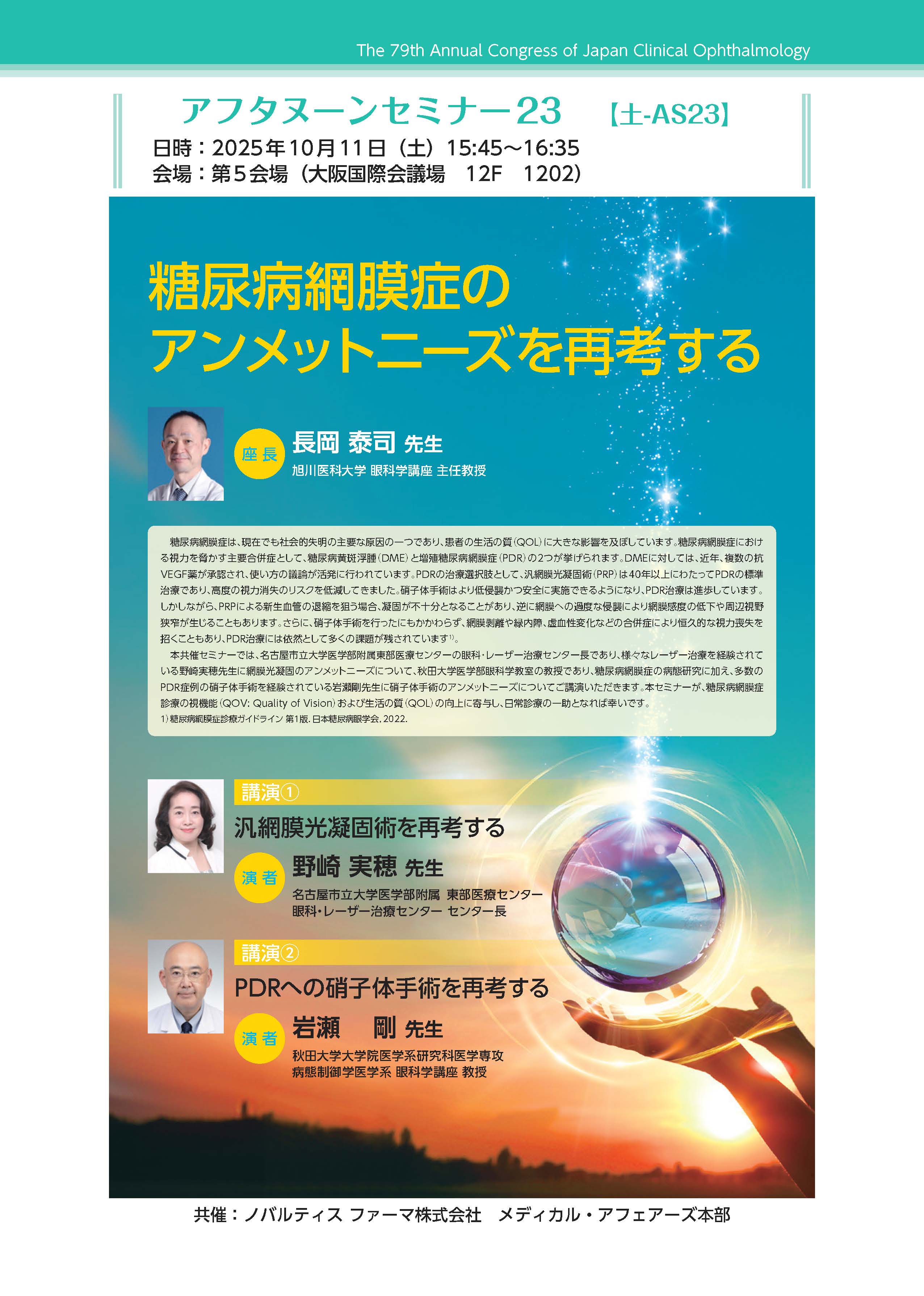 アフタヌーンセミナー 23 糖尿病網膜症のアンメットニーズを再考する 2025年10月11日(土) 15:45 - 16:35 第5会場 | 大阪国際会議場 12F 1202 共催:ノバルティス ファーマ株式会社 メディカル・アフェアーズ本部 |