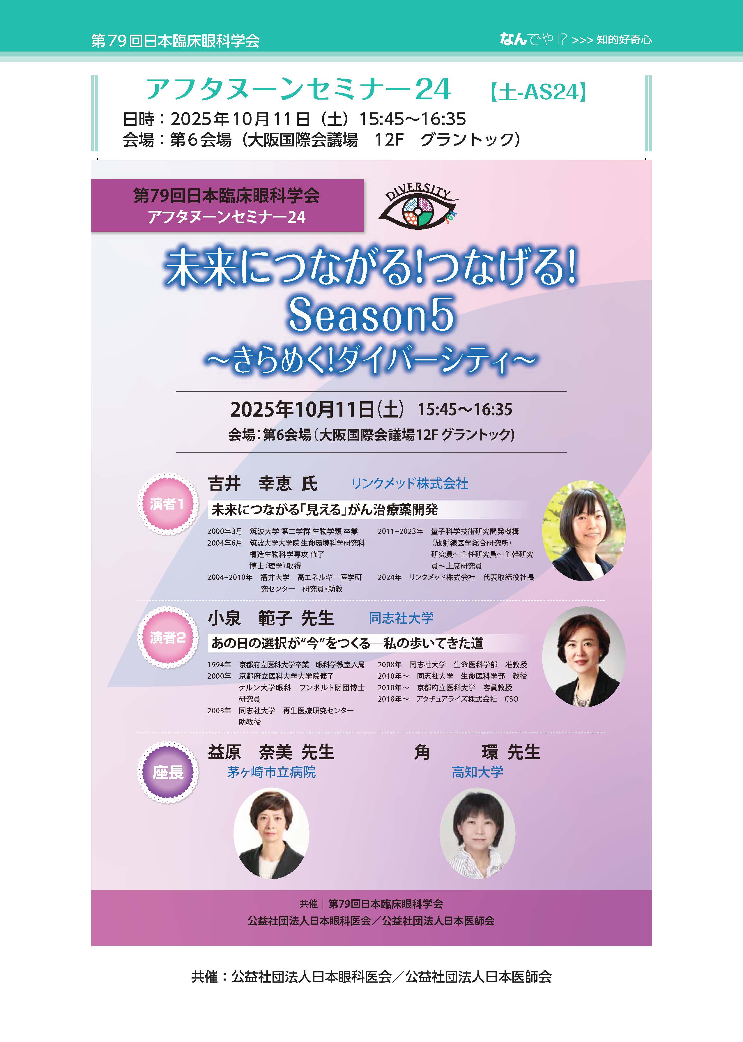 アフタヌーンセミナー 24 未来につながる!つなげる!Season5 ~きらめく!ダイバーシティ~ 2025年10月11日(土) 15:45 - 16:35 第6会場 | 大阪国際会議場 12F グラントック 共催:公益社団法人日本眼科医会/公益社団法人日本医師会 |
