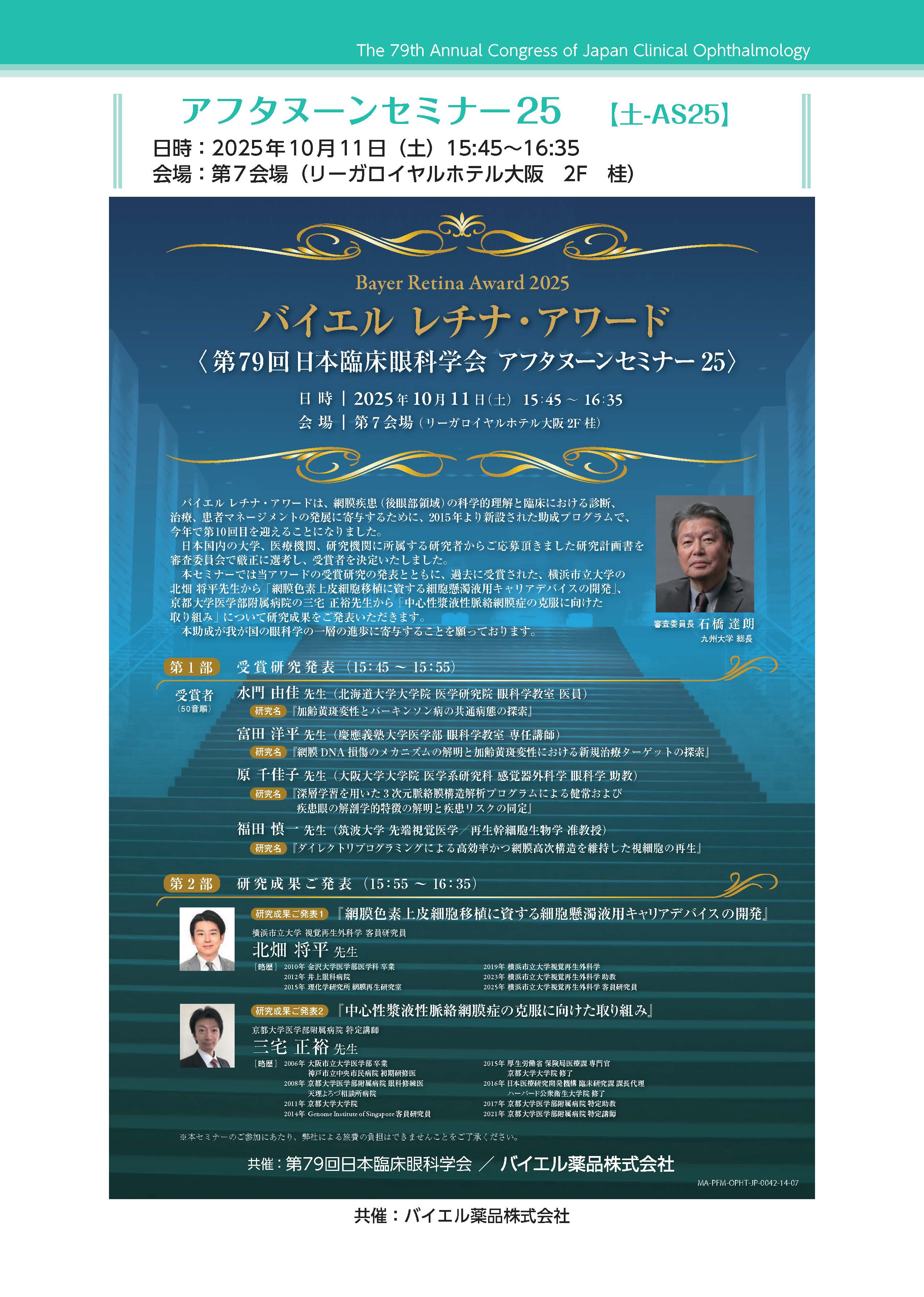 アフタヌーンセミナー 25 バイエル レチナ・アワード 2025年10月11日(土) 15:45 - 16:35 第7会場 | リーガロイヤルホテル大阪 2F 桂 共催:バイエル薬品株式会社 |