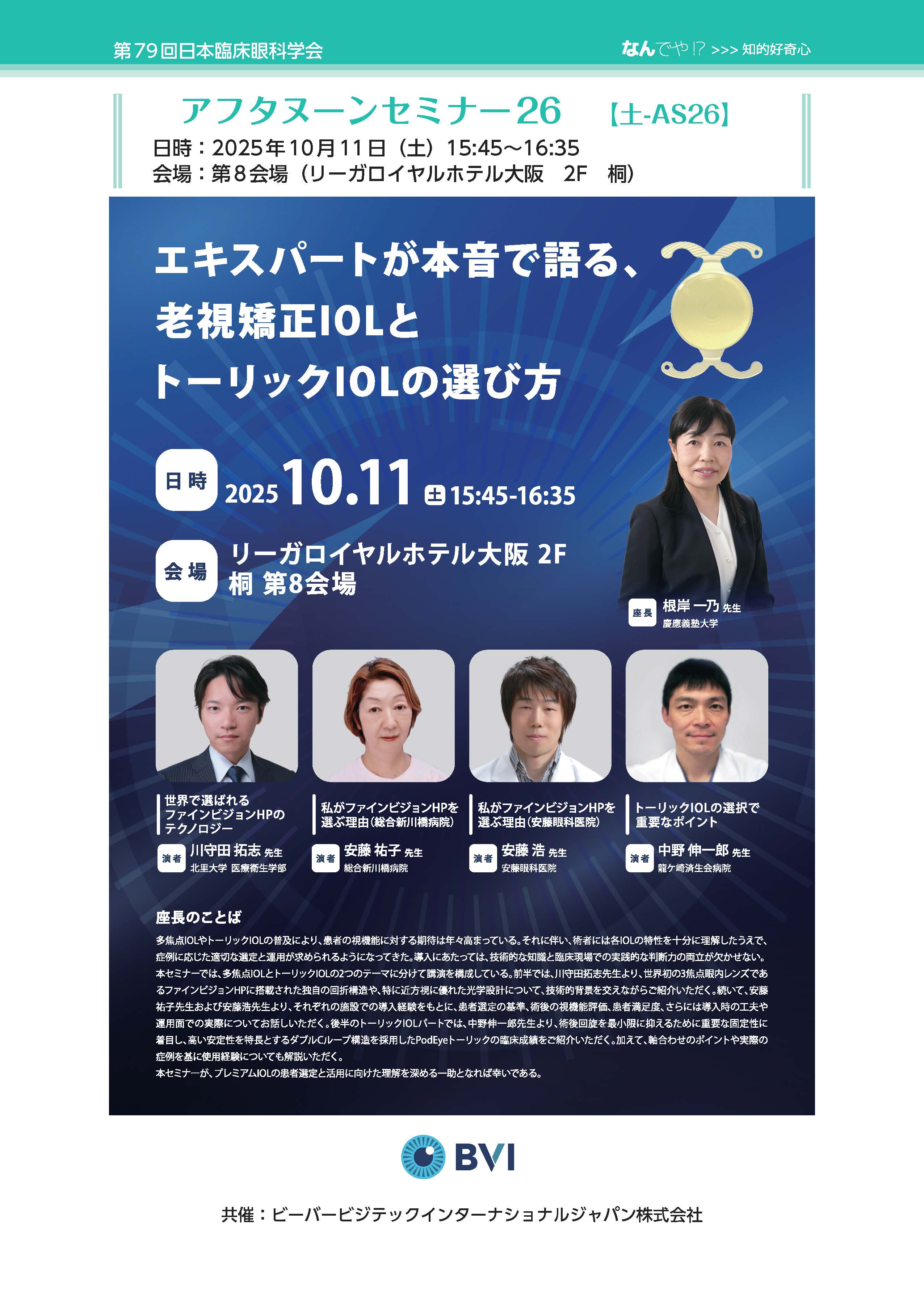 アフタヌーンセミナー 26 エキスパートが本音で語る、老視矯正IOLとトーリックIOLの選び方 2025年10月11日(土) 15:45 - 16:35 第8会場 | リーガロイヤルホテル大阪 2F 桐 共催:ビーバービジテックインターナショナルジャパン株式会社 |
