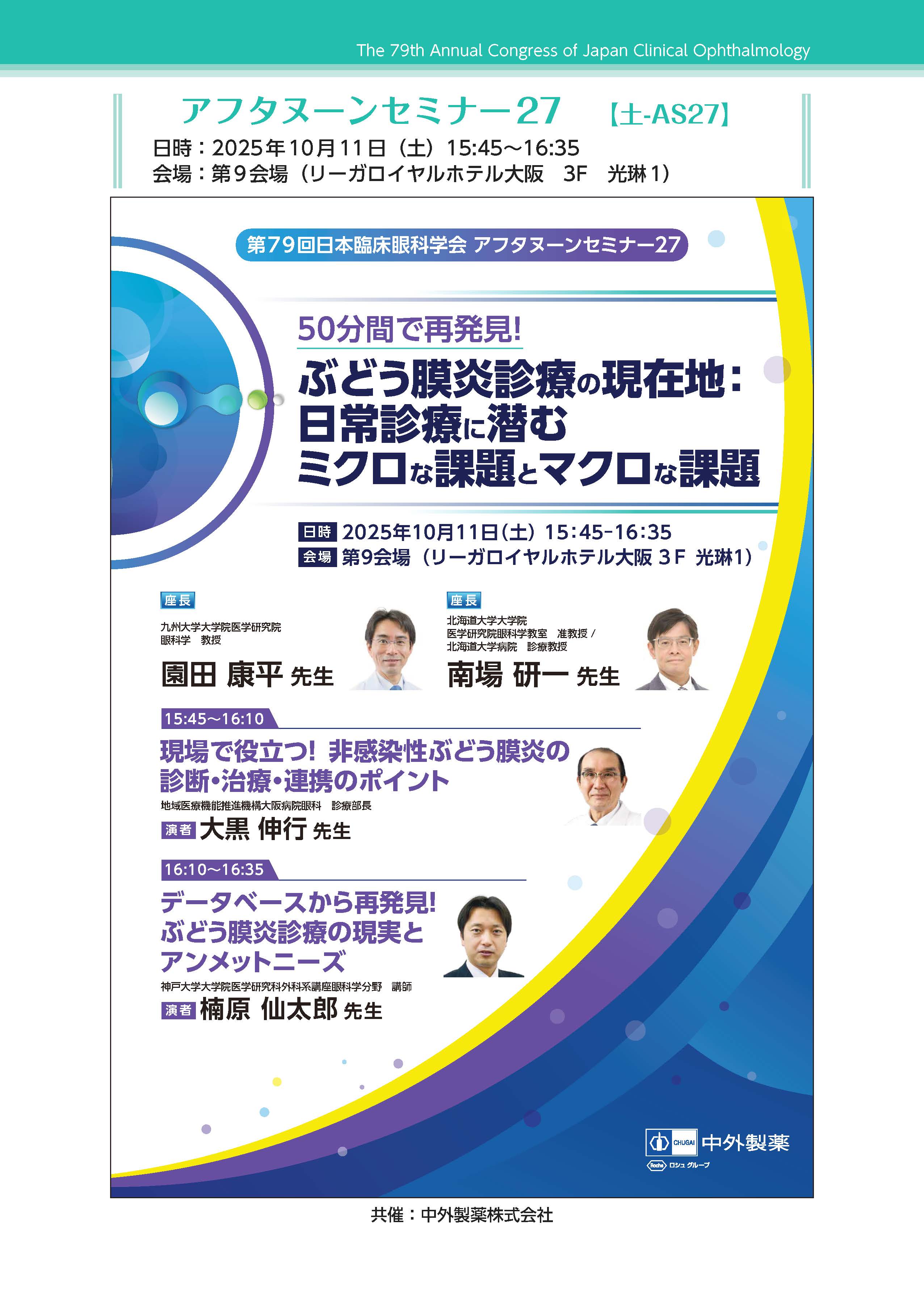 アフタヌーンセミナー 27 50分間で再発見! ぶどう膜炎診療の現在地: 日常診療に潜む ミクロな課題とマクロな課題 2025年10月11日(土) 15:45 - 16:35 第9会場 | リーガロイヤルホテル大阪 3F 光琳1 共催:中外製薬株式会社 |