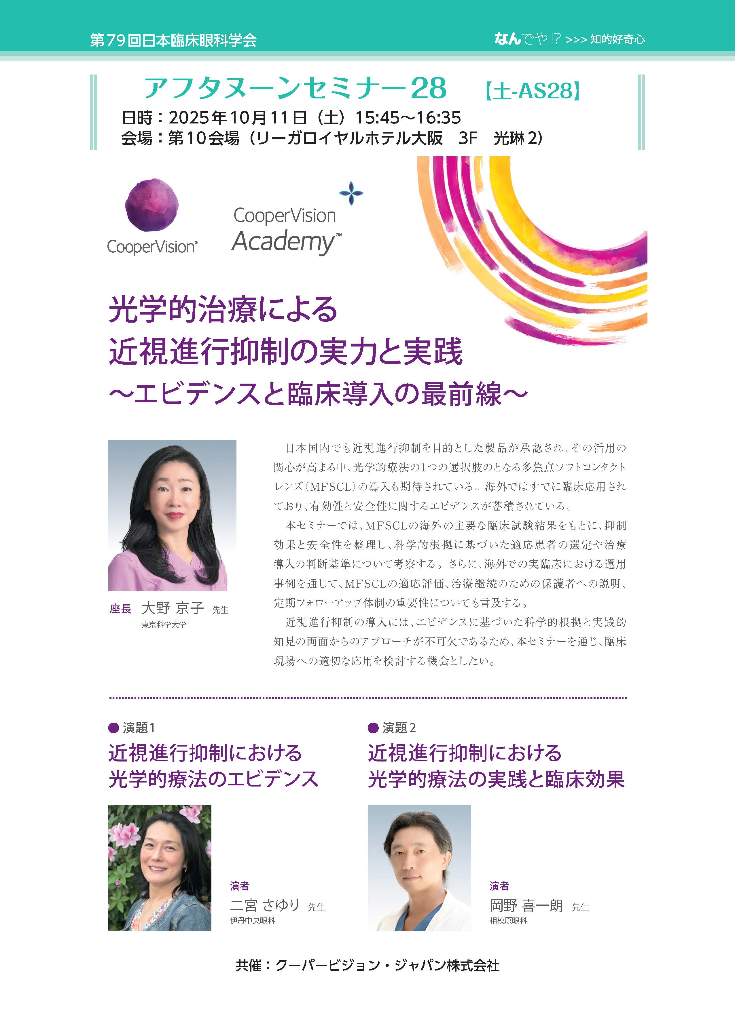 アフタヌーンセミナー 28 光学的治療による近視進行抑制の実力と実践 ~エビデンスと臨床導入の最前線~ 2025年10月11日(土) 15:45 - 16:35 第10会場 | リーガロイヤルホテル大阪 3F 光琳2 共催:クーパービジョン・ジャパン株式会社 |