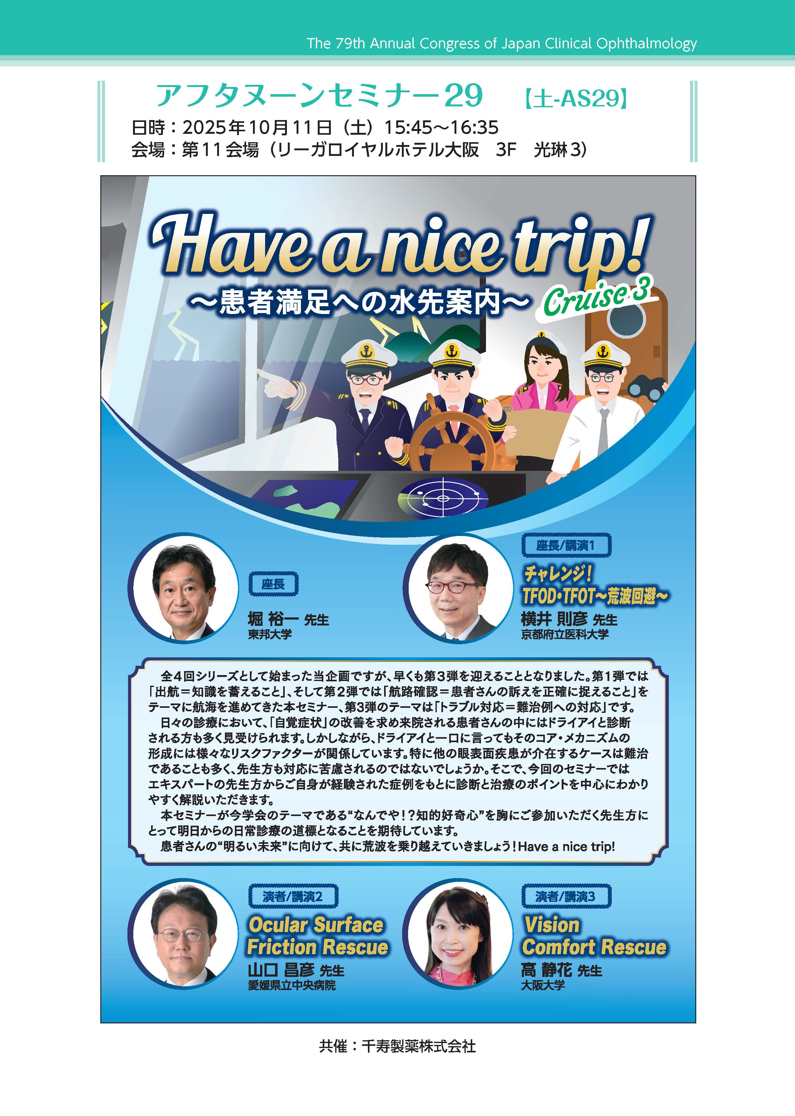 アフタヌーンセミナー 29 Have a nice trip! ~患者満足への水先案内~ Cruise 3 2025年10月11日(土) 15:45 - 16:35 第11会場 | リーガロイヤルホテル大阪 3F 光琳3 共催:千寿製薬株式会社 |