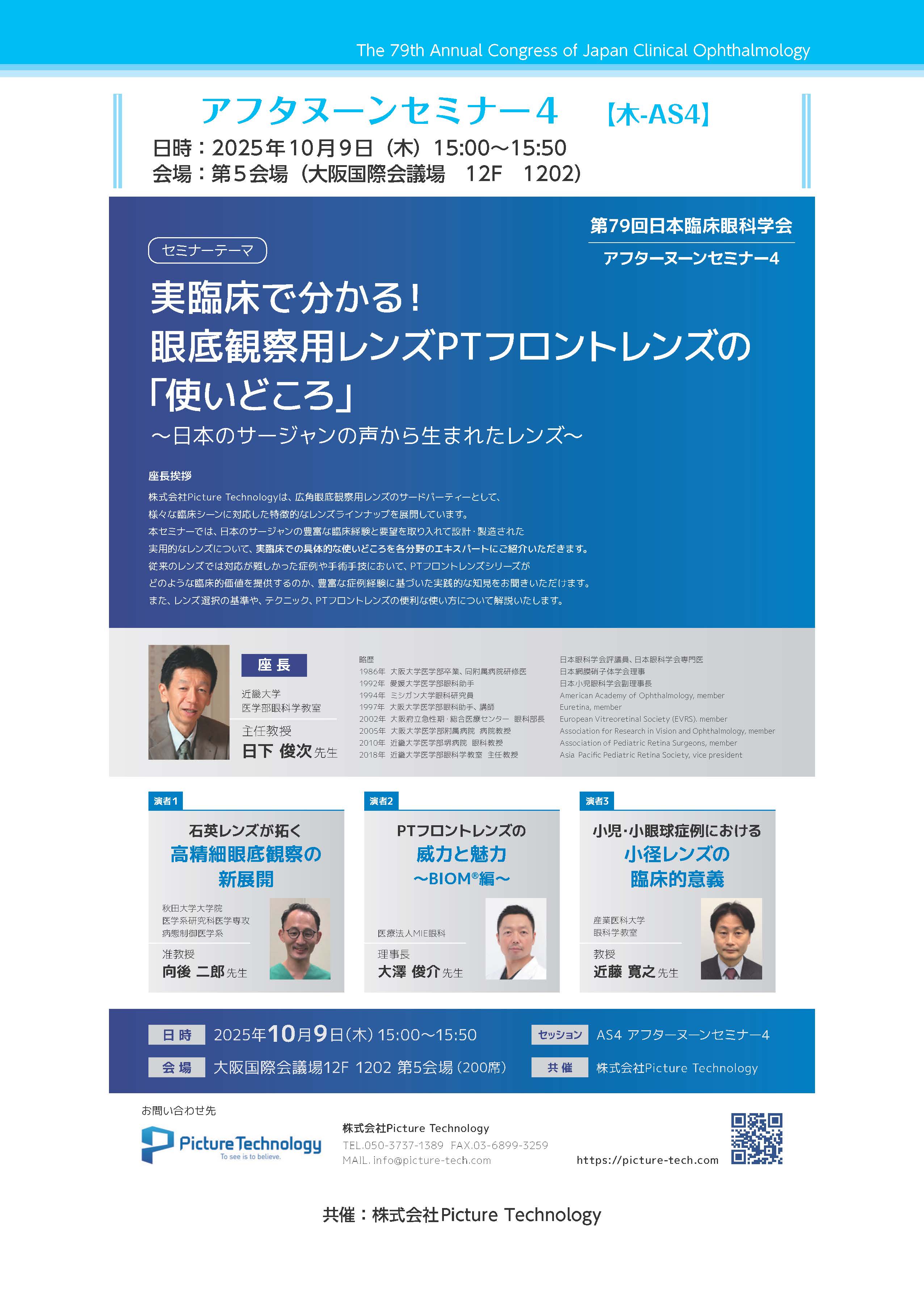 アフタヌーンセミナー 4 実臨床で分かる!眼底観察用レンズPTフロントレンズの「使いどころ」 ~日本のサージャンの声から生まれたレンズ~ 2025年10月9日(木) 15:00 - 15:50 第5会場 | 大阪国際会議場 12F 1202 共催:株式会社Picture Technology |