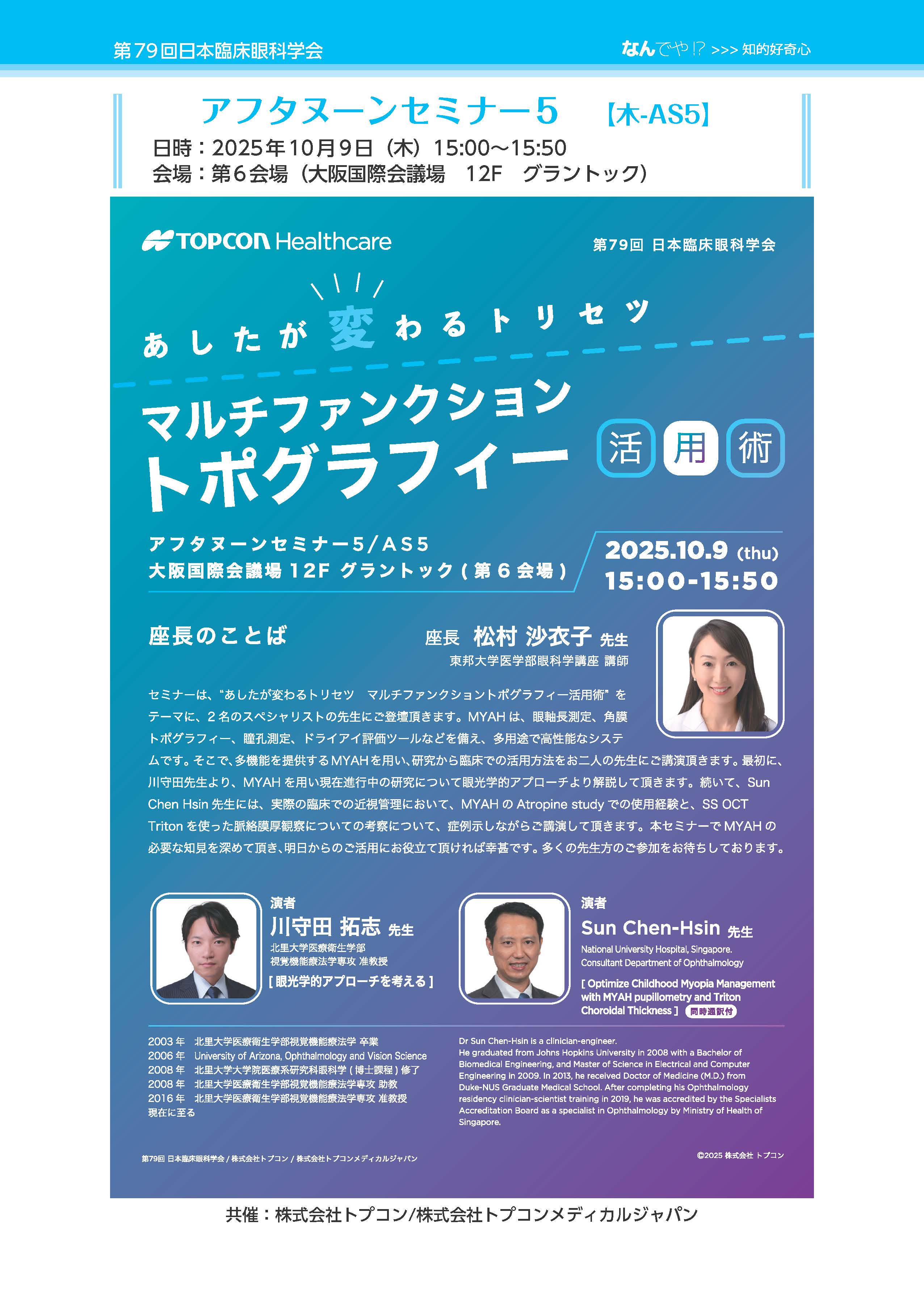 アフタヌーンセミナー 5 あしたが変わるトリセツ マルチファンクショントポグラフィー活用術 2025年10月9日(木) 15:00 - 15:50 第6会場 | 大阪国際会議場 12F グラントック 共催:株式会社トプコン/株式会社トプコンメディカルジャパン |