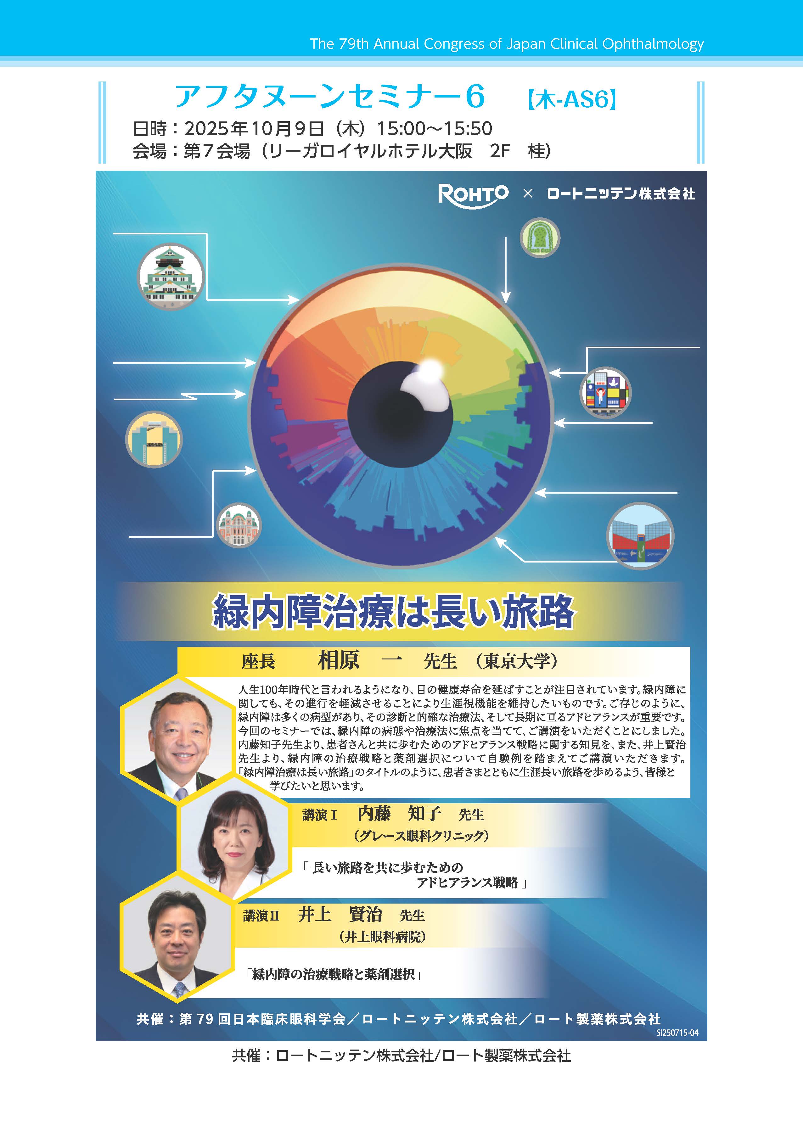 アフタヌーンセミナー 6 緑内障治療は長い旅路 2025年10月9日(木) 15:00 - 15:50 第7会場 | リーガロイヤルホテル大阪 2F 桂 共催:ロートニッテン株式会社/ロート製薬株式会社 |