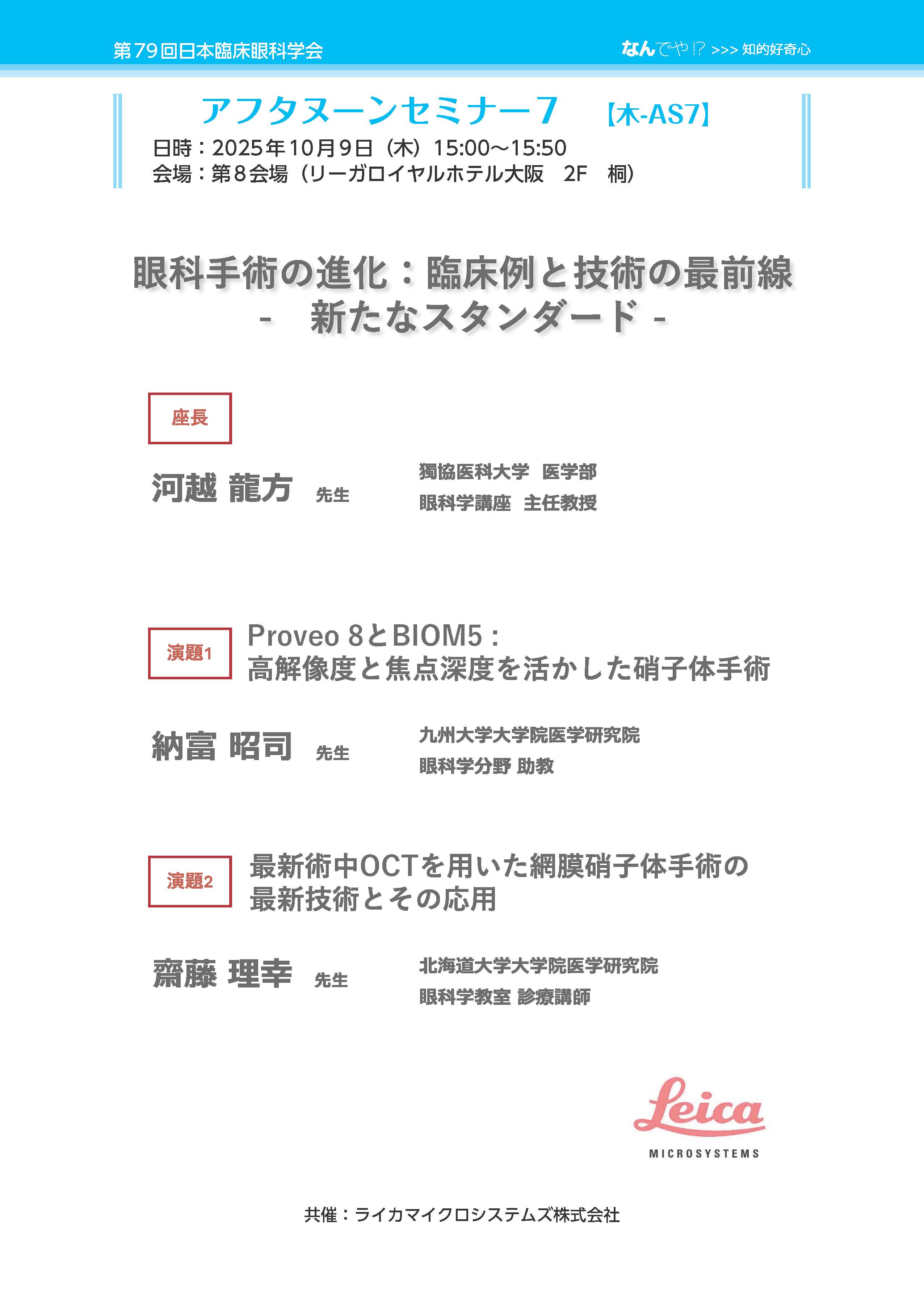 アフタヌーンセミナー 7 眼科手術の進化:臨床例と技術の最前線 -新たなスタンダードー 2025年10月9日(木) 15:00 - 15:50 第8会場 | リーガロイヤルホテル大阪 2F 桐 共催:ライカマイクロシステムズ株式会社 |