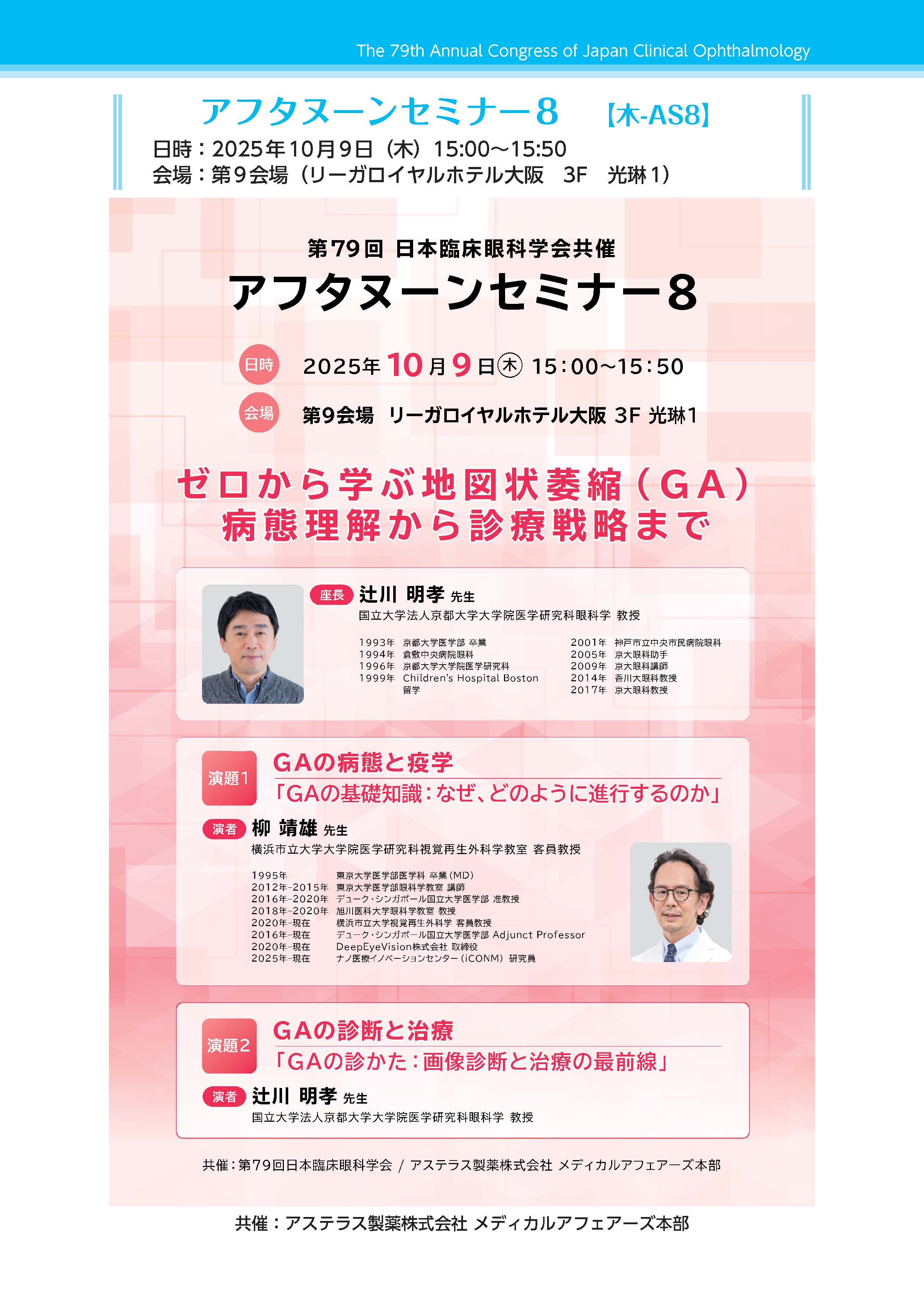 アフタヌーンセミナー 8 ゼロから学ぶ地図状萎縮( G A ) 病態理解から診療戦略まで 2025年10月9日(木) 15:00 - 15:50 第9会場 | リーガロイヤルホテル大阪 3F 光琳1 共催:アステラス製薬株式会社 メディカルアフェアーズ本部 |