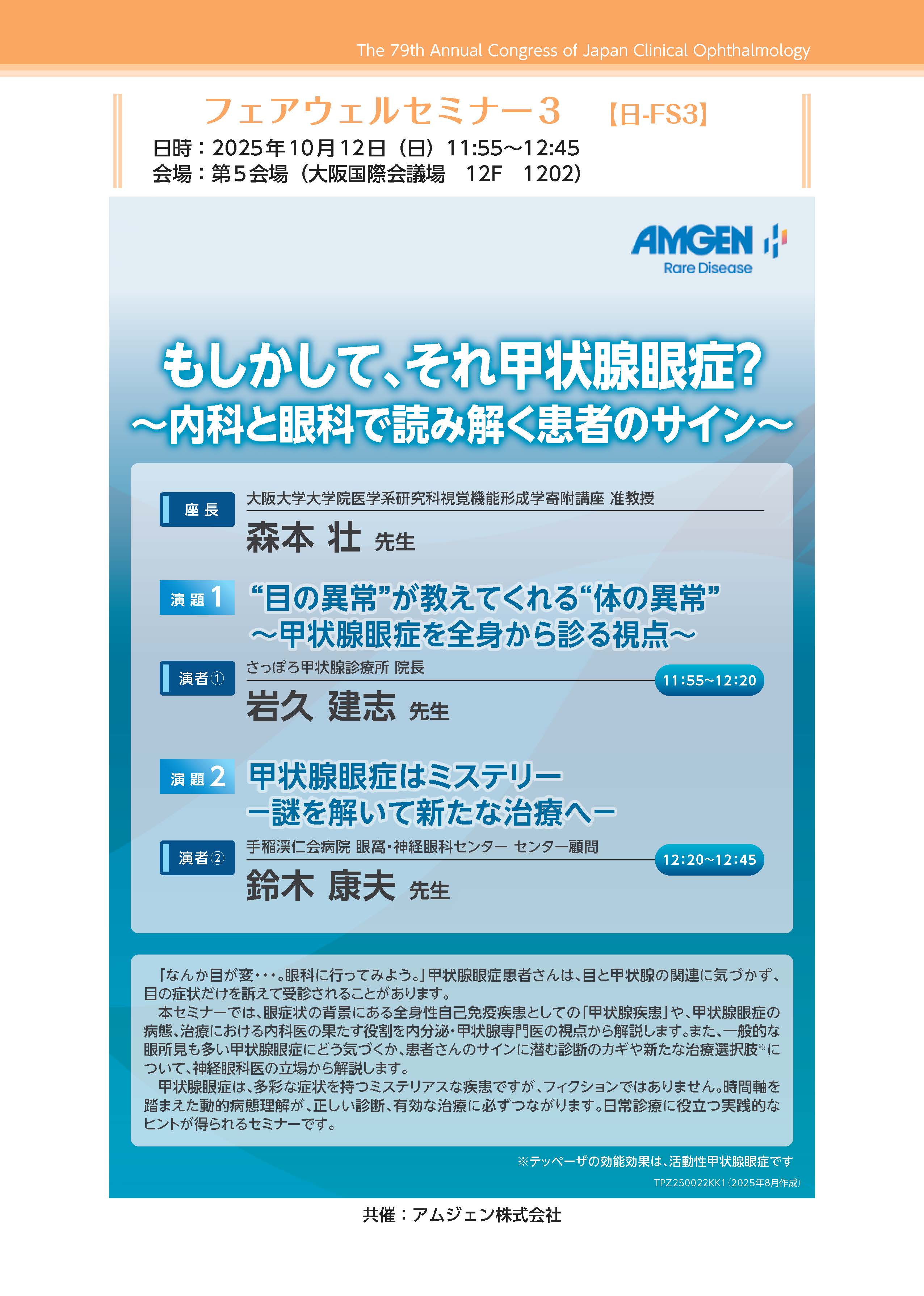 フェアウェルセミナー 3 もしかして、それ甲状腺眼症? ~内科と眼科で読み解く患者のサイン~ 2025年10月12日(日) 11:55 - 12:45 第5会場 | 大阪国際会議場 12F 1202 共催:アムジェン株式会社 |