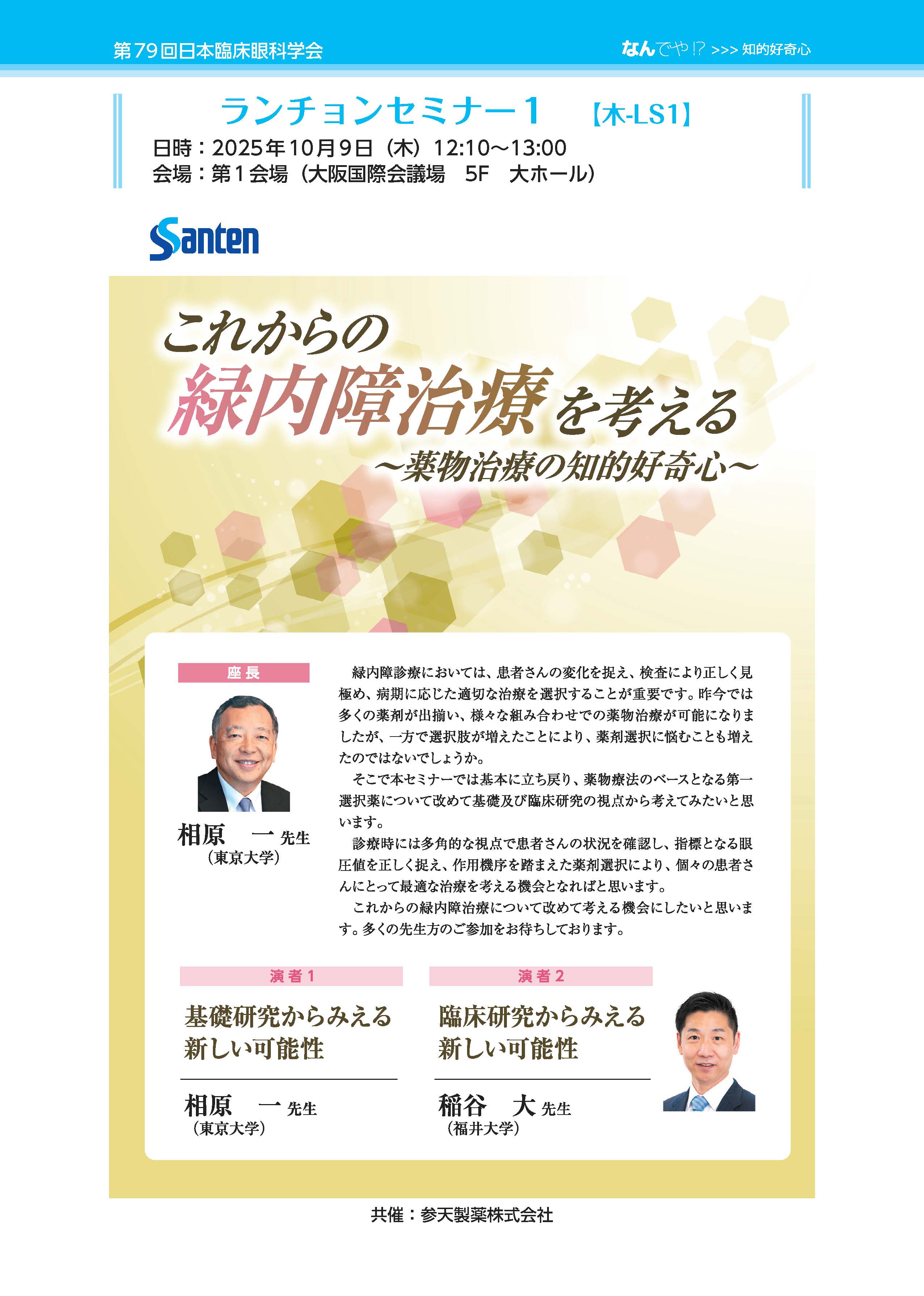 ランチョンセミナー 1 これからの緑内障治療を考える~薬物治療の知的好奇心~ 2025年10月9日(木) 12:10 - 13:00 第1会場 | 大阪国際会議場 5F 大ホール 共催:参天製薬株式会社 |