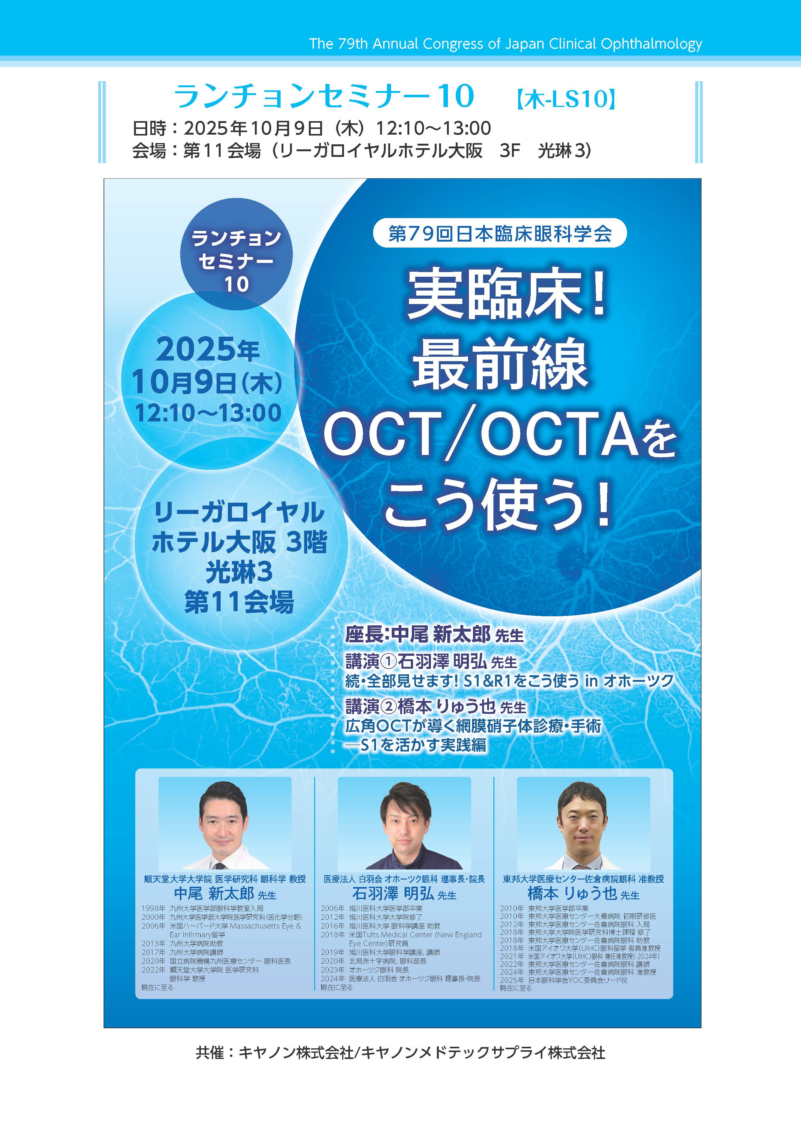 ランチョンセミナー 10 実臨床!最前線 OCT/OCTAをこう使う! 2025年10月9日(木) 12:10 - 13:00 第11会場 | リーガロイヤルホテル大阪 3F 光琳3 共催:キヤノン株式会社/キヤノンメドテックサプライ株式会社 |