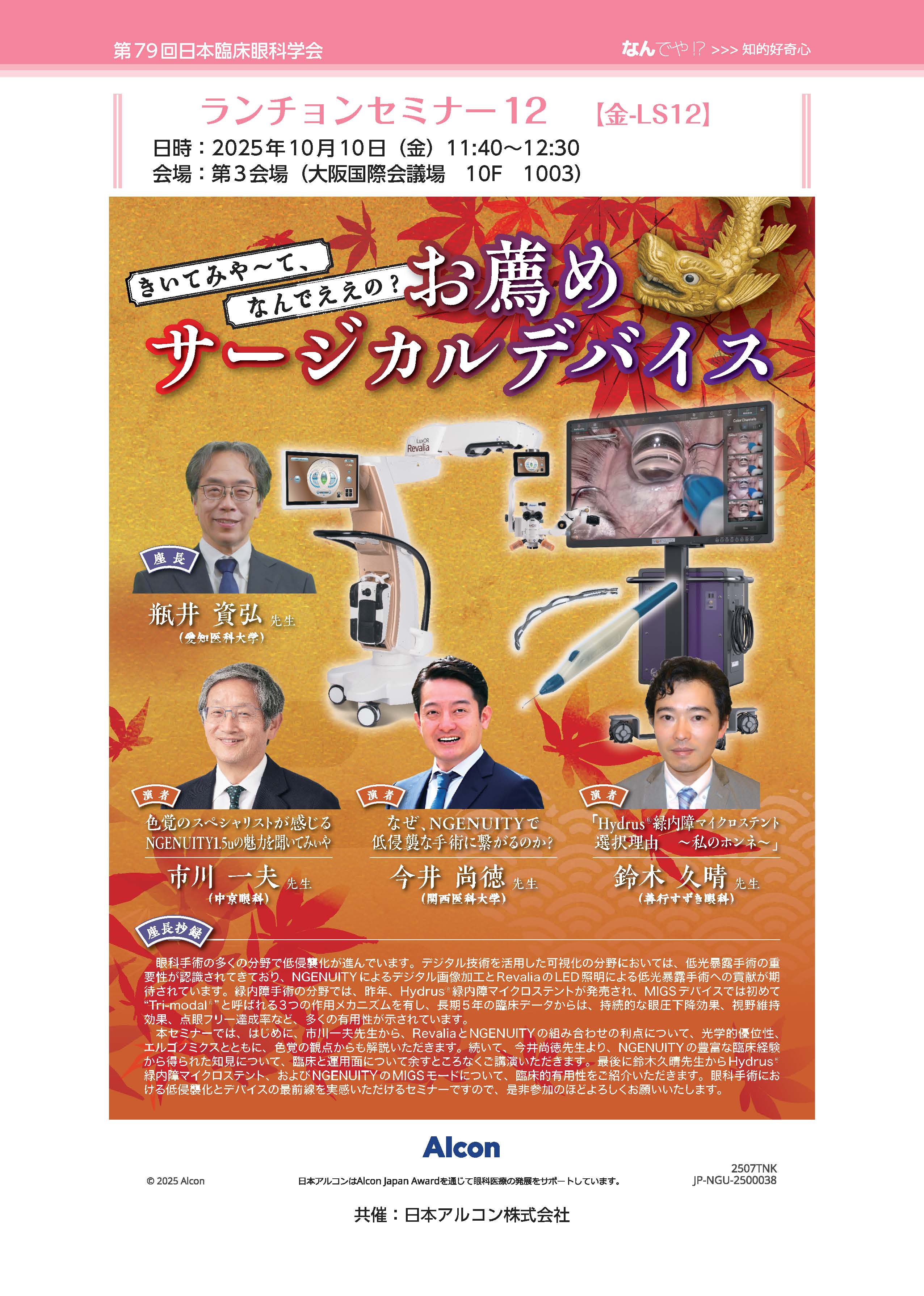 ランチョンセミナー 12 きいてみや~て、なんでええの?お薦めサージカルデバイス 2025年10月10日(金) 11:40 - 12:30 第3会場 | 大阪国際会議場 10F 1003 共催:日本アルコン株式会社 |