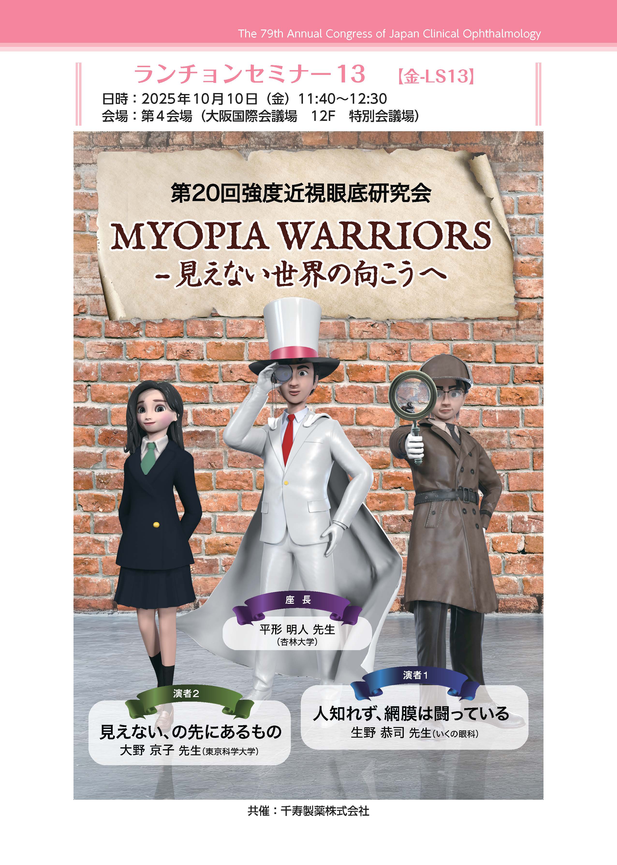 ランチョンセミナー 13 第20回強度近視眼底研究会 MYOPIA WARRIORS ー見えない世界の向こうへ 2025年10月10日(金) 11:40 - 12:30 第4会場 | 大阪国際会議場 12F 特別会議場 共催:千寿製薬株式会社 |