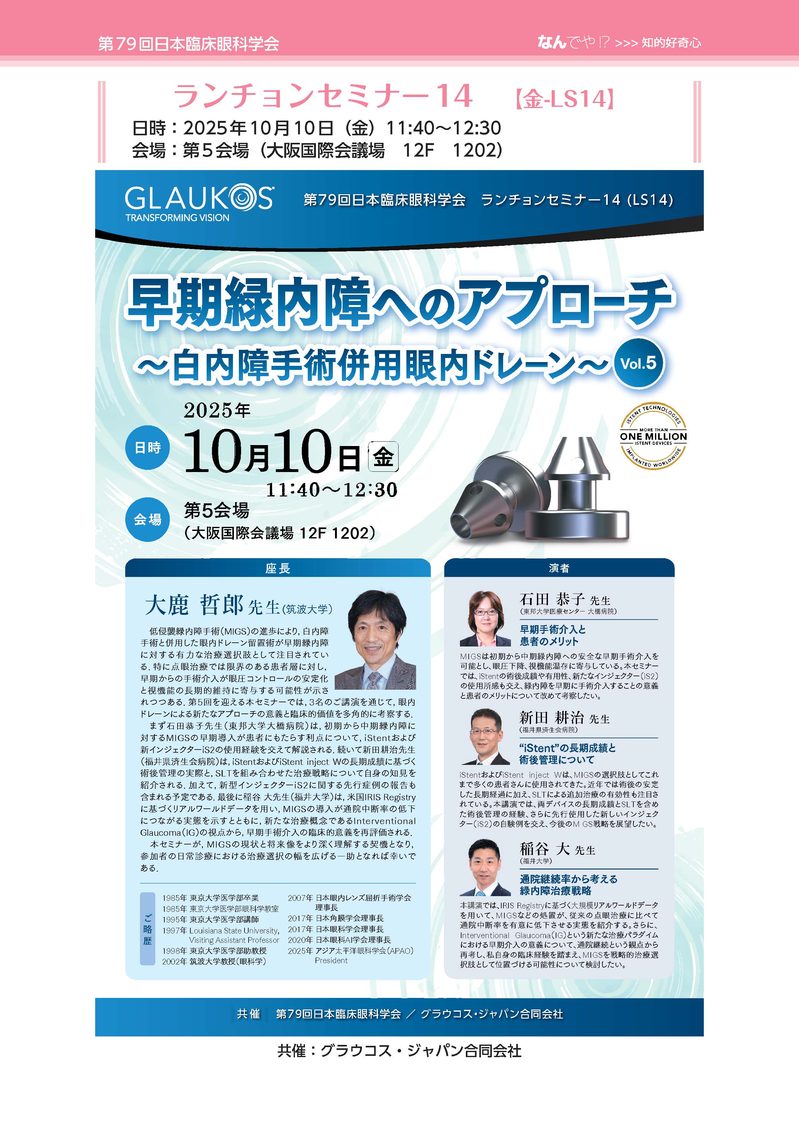 ランチョンセミナー 14 早期緑内障へのアプローチ ~白内障手術併用眼内ドレーン~ Vol.5 2025年10月10日(金) 11:40 - 12:30 第5会場 | 大阪国際会議場 12F 1202 共催:グラウコス・ジャパン合同会社 |