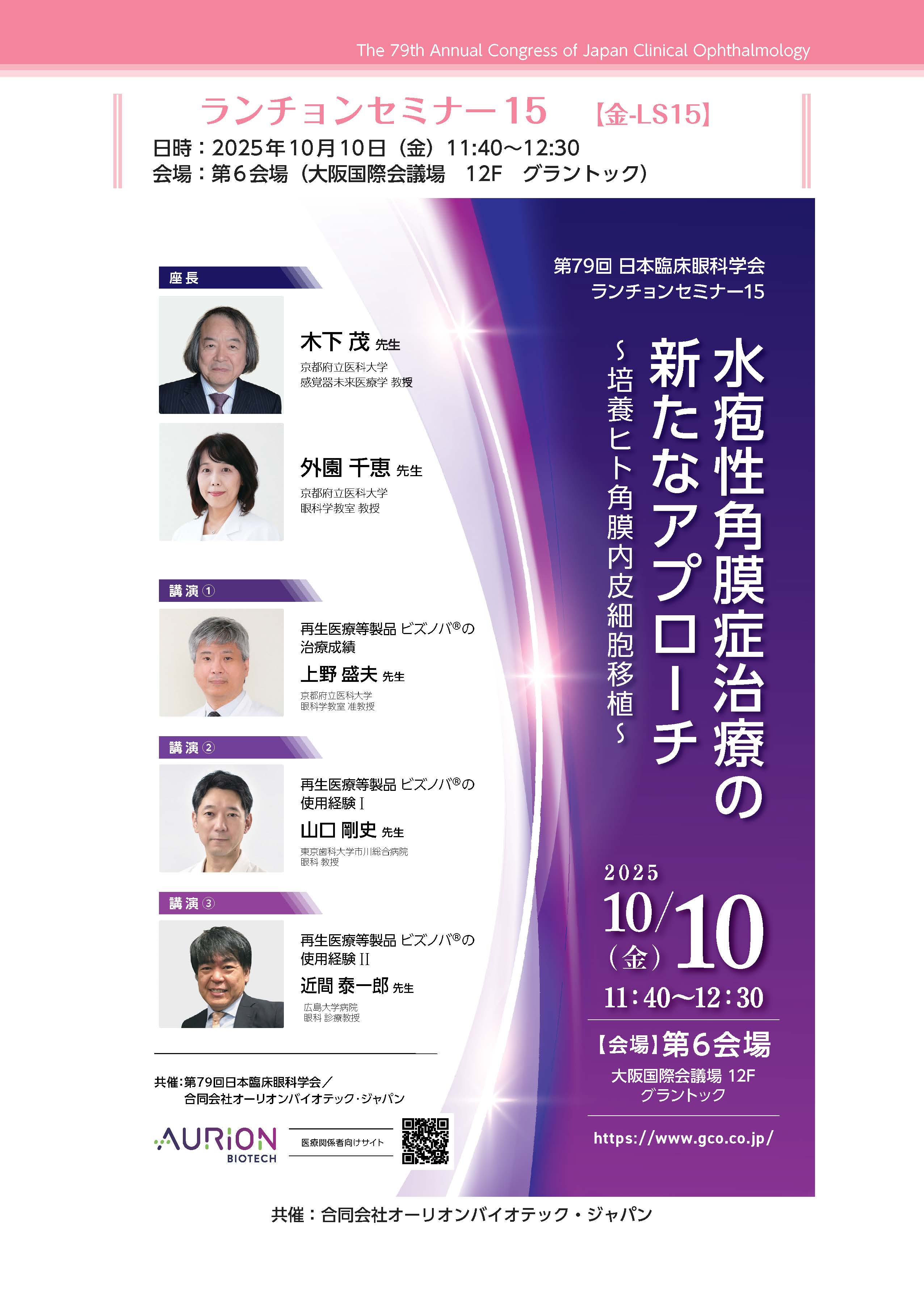 ランチョンセミナー 15 水疱性角膜症治療の新たなアプローチ~培養ヒト角膜内皮細胞移植~ 2025年10月10日(金) 11:40 - 12:30 第6会場 | 大阪国際会議場 12F グラントック 共催:合同会社オーリオンバイオテック・ジャパン |