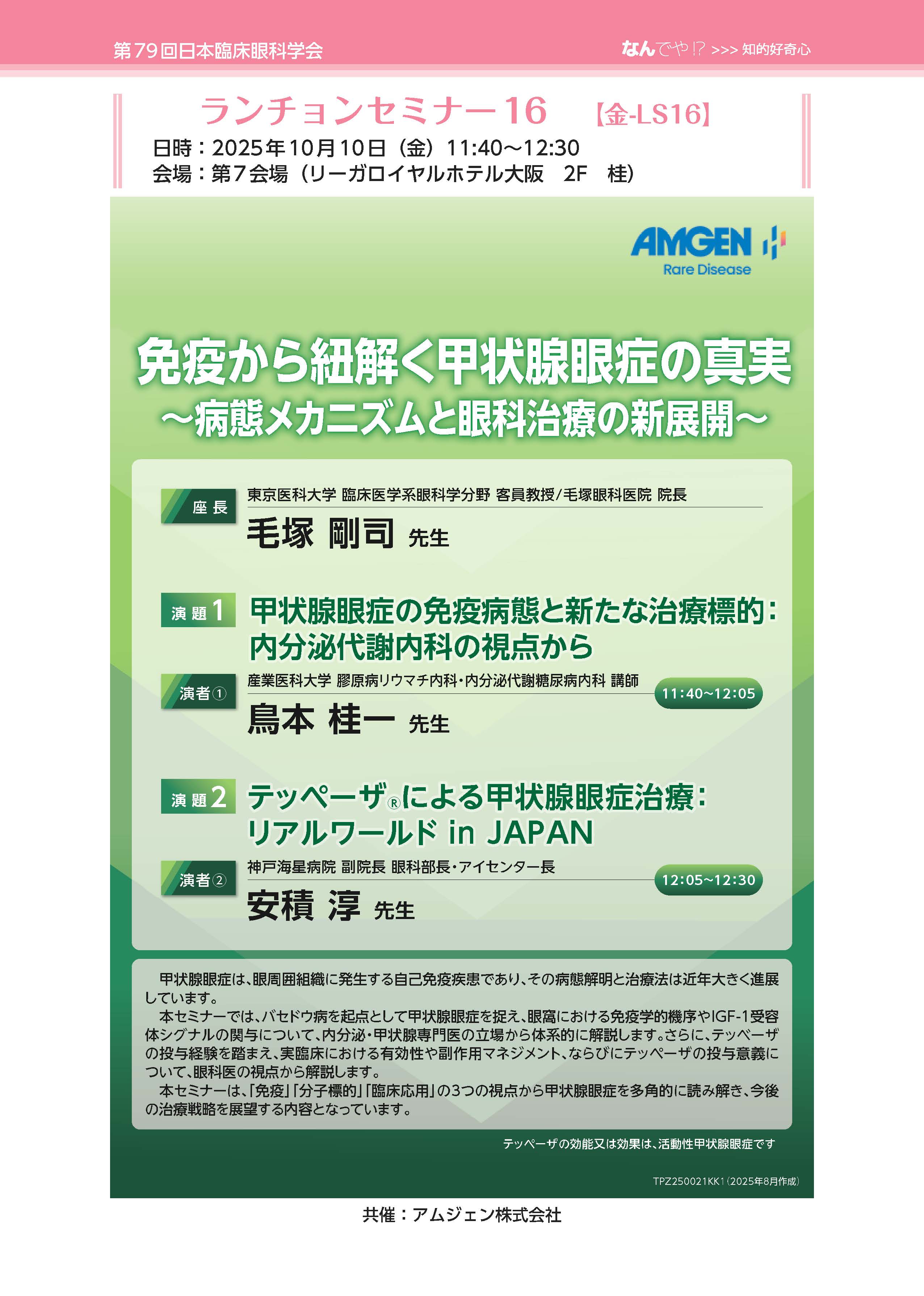 ランチョンセミナー 16 免疫から紐解く甲状腺眼症の真実 ~病態メカニズムと眼科治療の新展開~ 2025年10月10日(金) 11:40 - 12:30 第7会場 | リーガロイヤルホテル大阪 2F 桂 共催:アムジェン株式会社 |