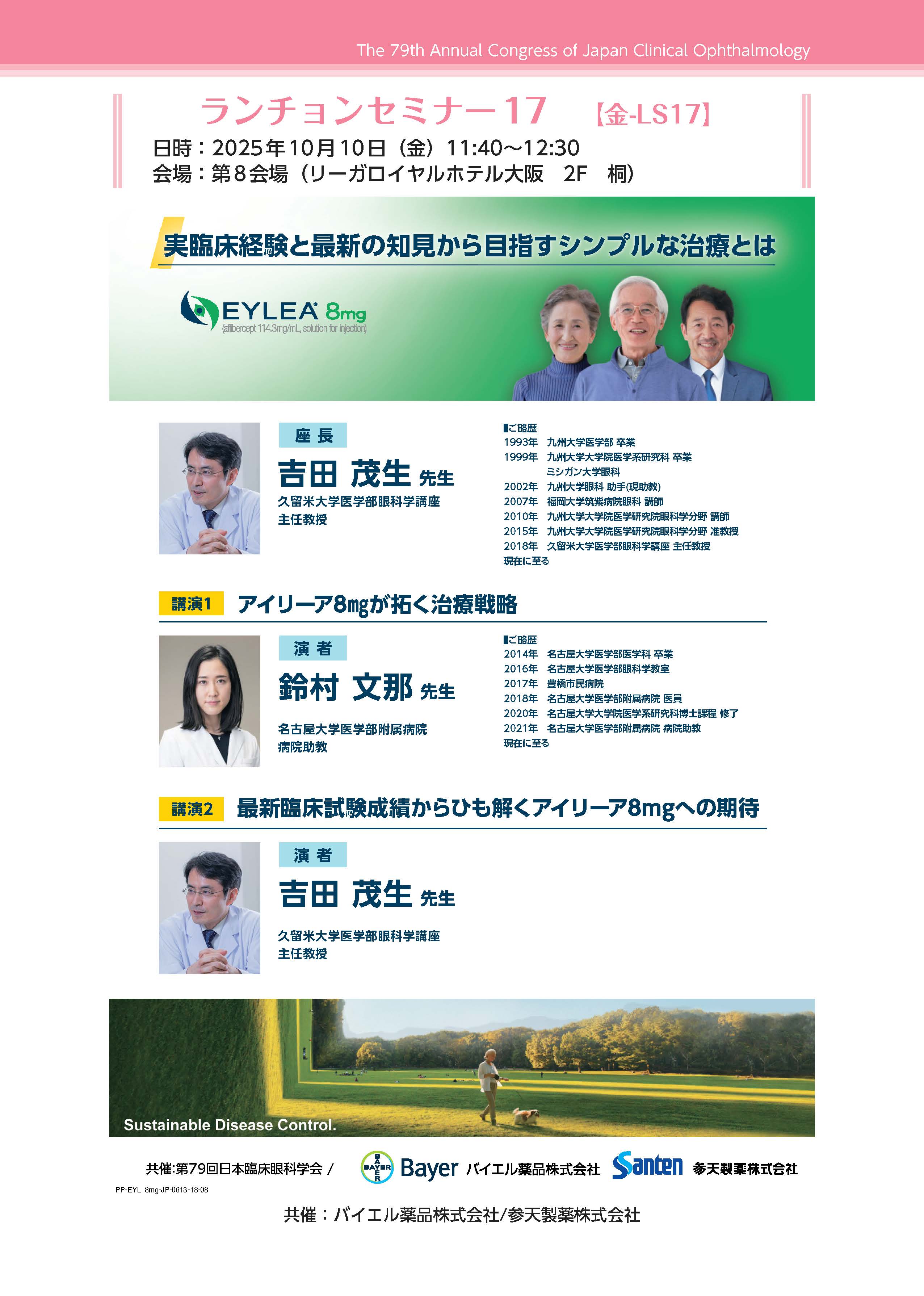 ランチョンセミナー 17 実臨床経験と最新の知見から目指すシンプルな治療とは 2025年10月10日(金) 11:40 - 12:30 第8会場 | リーガロイヤルホテル大阪 2F 桐 共催:バイエル薬品株式会社/参天製薬株式会社 |