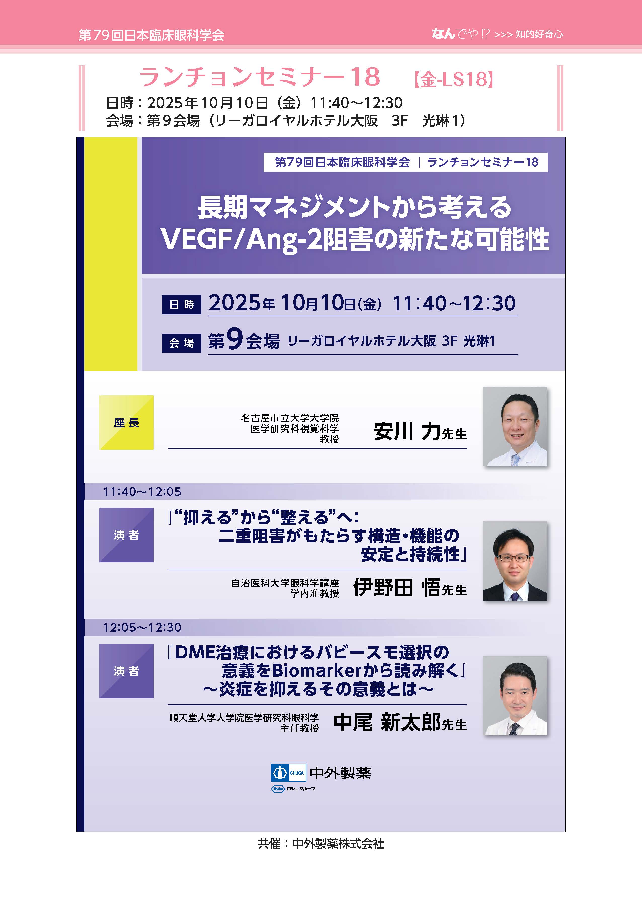 ランチョンセミナー 18 長期マネジメントから考える VEGF/Ang-2阻害の新たな可能性 2025年10月10日(金) 11:40 - 12:30 第9会場 | リーガロイヤルホテル大阪 3F 光琳1 共催:中外製薬株式会社 |