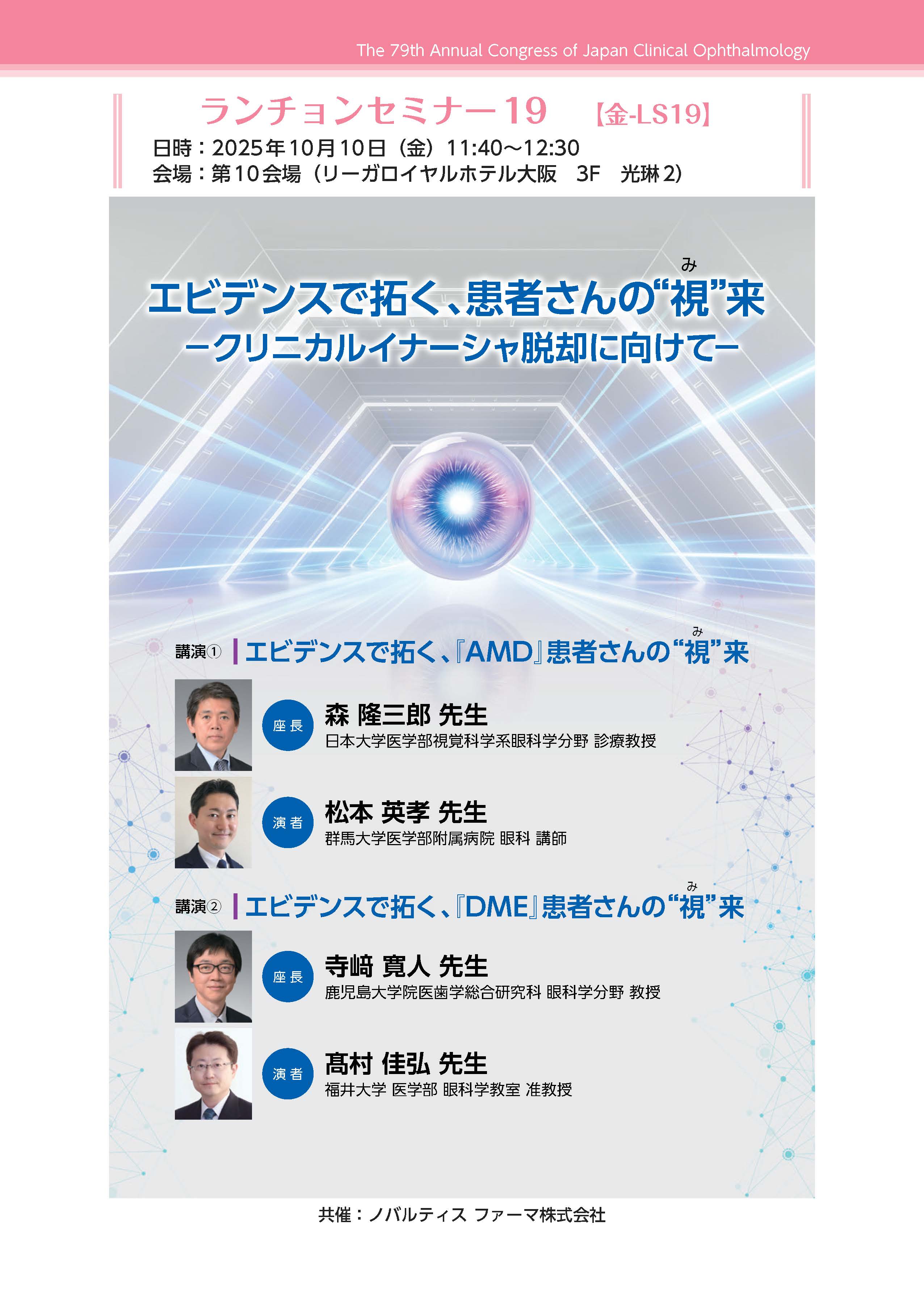 ランチョンセミナー 19 エビデンスで拓く、患者さんの”視”(み)来 -クリニカルイナーシャ脱却に向けて- 2025年10月10日(金) 11:40 - 12:30 第10会場 | リーガロイヤルホテル大阪 3F 光琳2 共催:ノバルティス ファーマ株式会社 |