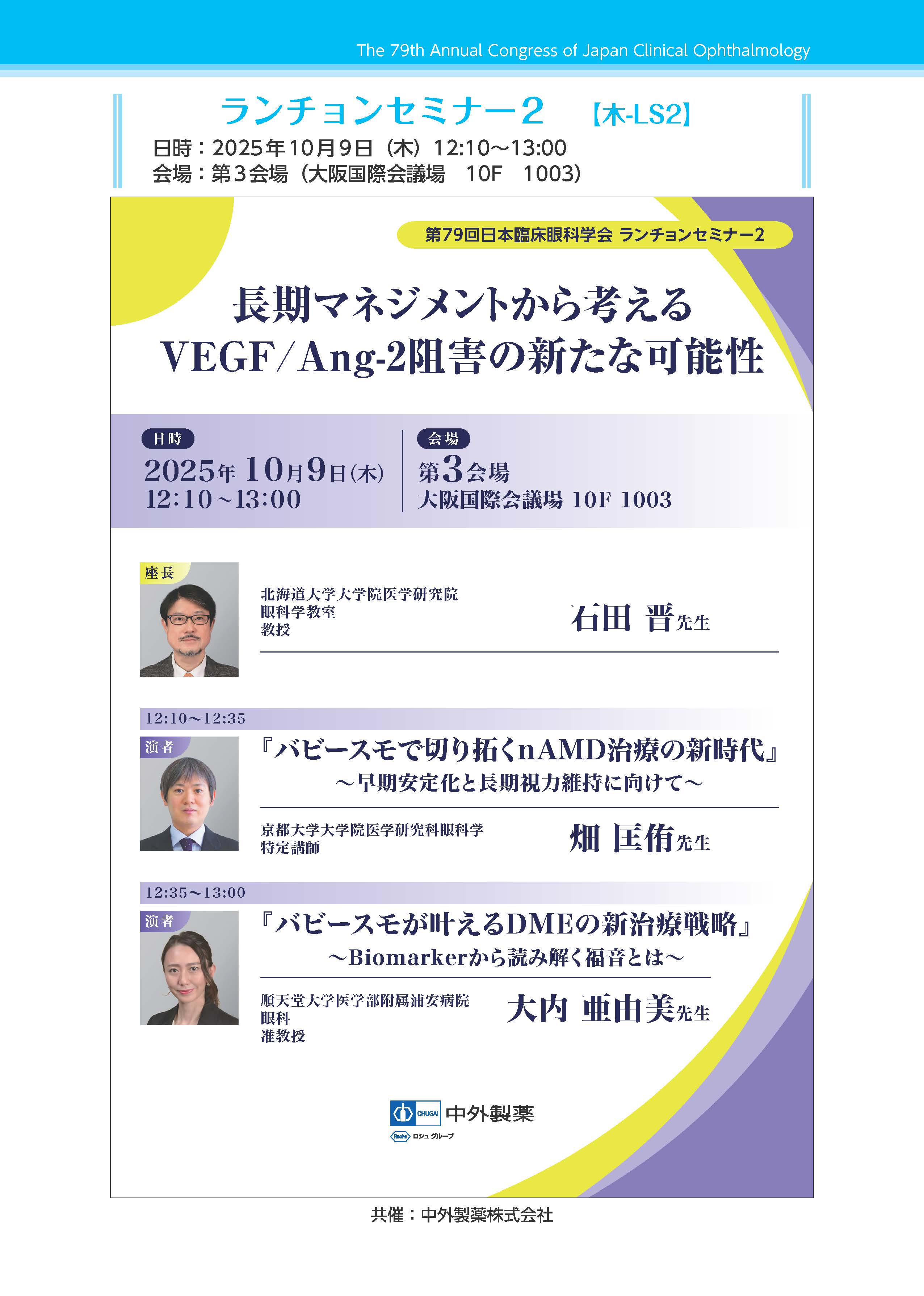 ランチョンセミナー 2 長期マネジメントから考える VEGF/Ang-2阻害の新たな可能性 2025年10月9日(木) 12:10 - 13:00 第3会場 | 大阪国際会議場 10F 1003 共催:中外製薬株式会社 |