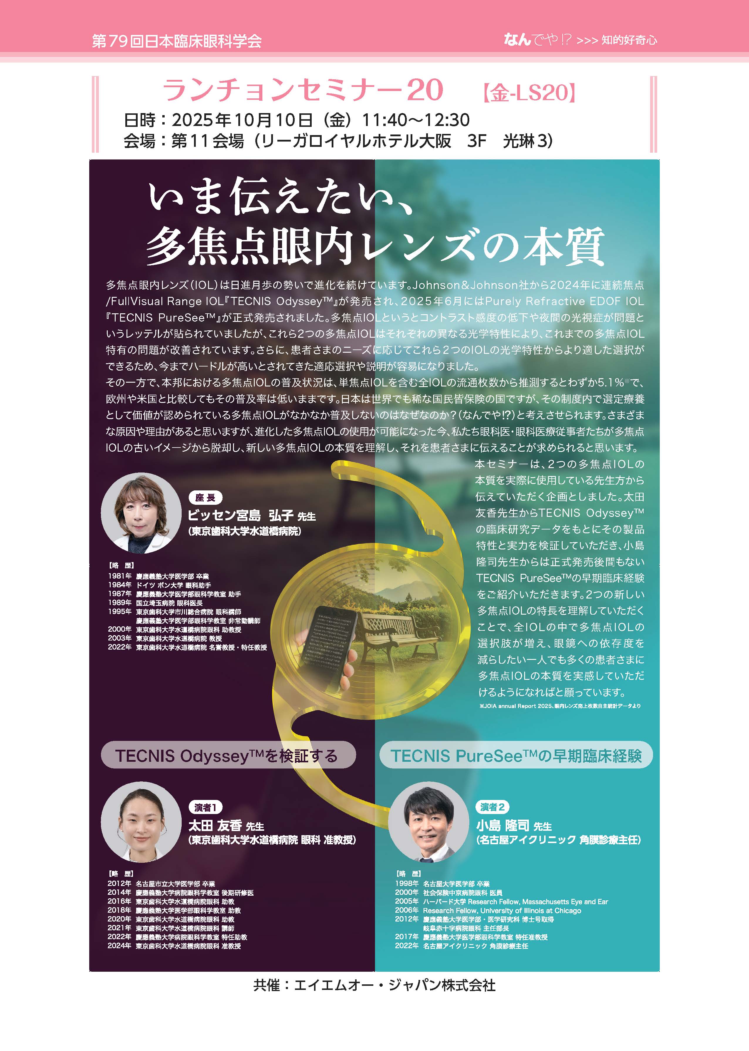 ランチョンセミナー 20 いま伝えたい、多焦点眼内レンズの本質 2025年10月10日(金) 11:40 - 12:30 第11会場 | リーガロイヤルホテル大阪 3F 光琳3 共催:エイエムオー・ジャパン株式会社 |