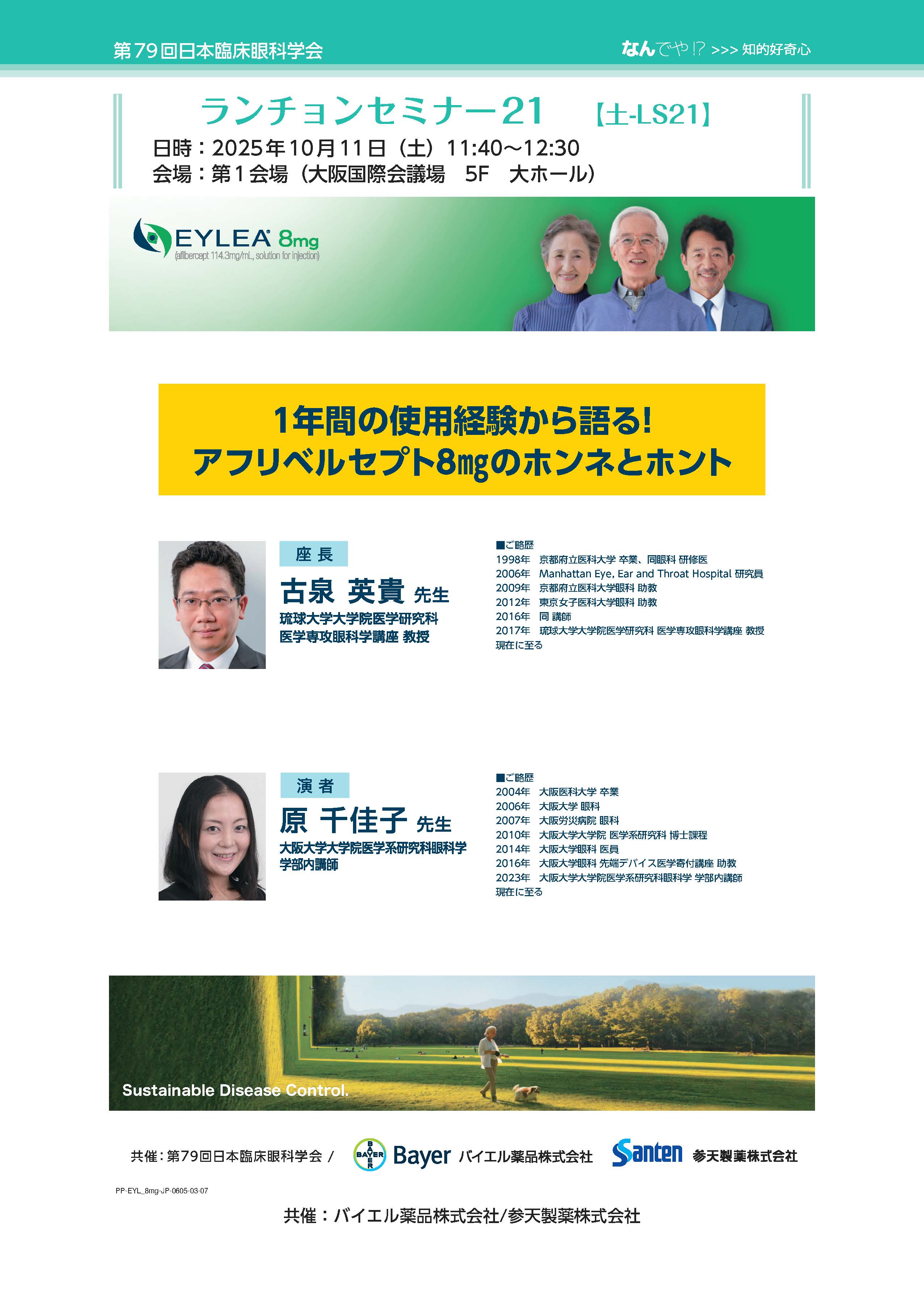 ランチョンセミナー 21 1年間の使用経験から語る!アフリベルセプト8mgのホンネとホント 2025年10月11日(土) 11:40 - 12:30 第1会場 | 大阪国際会議場 5F 大ホール 共催:バイエル薬品株式会社/参天製薬株式会社 |