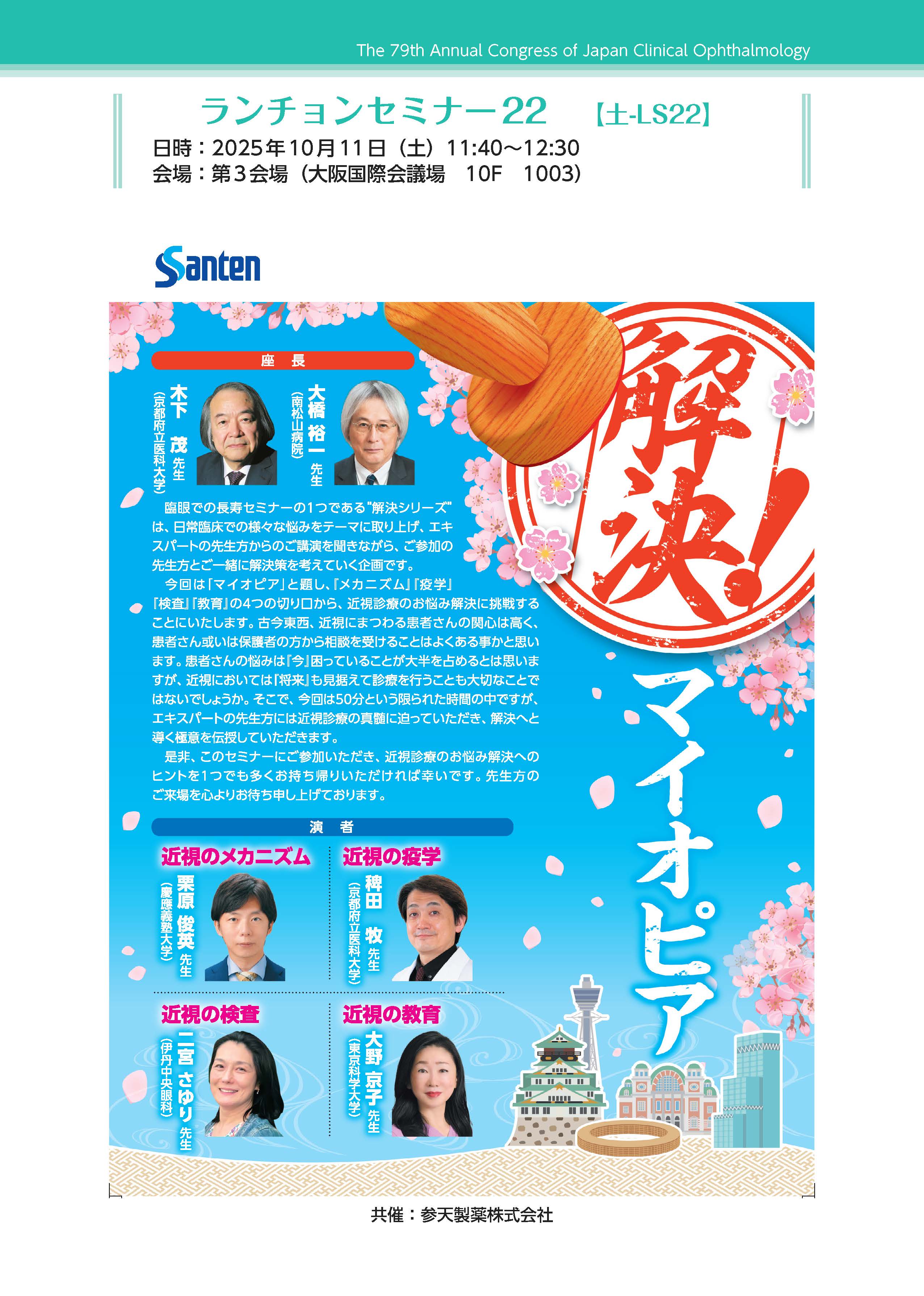 ランチョンセミナー 22 解決!マイオピア 2025年10月11日(土) 11:40 - 12:30 第3会場 | 大阪国際会議場 10F 1003 共催:参天製薬株式会社 |