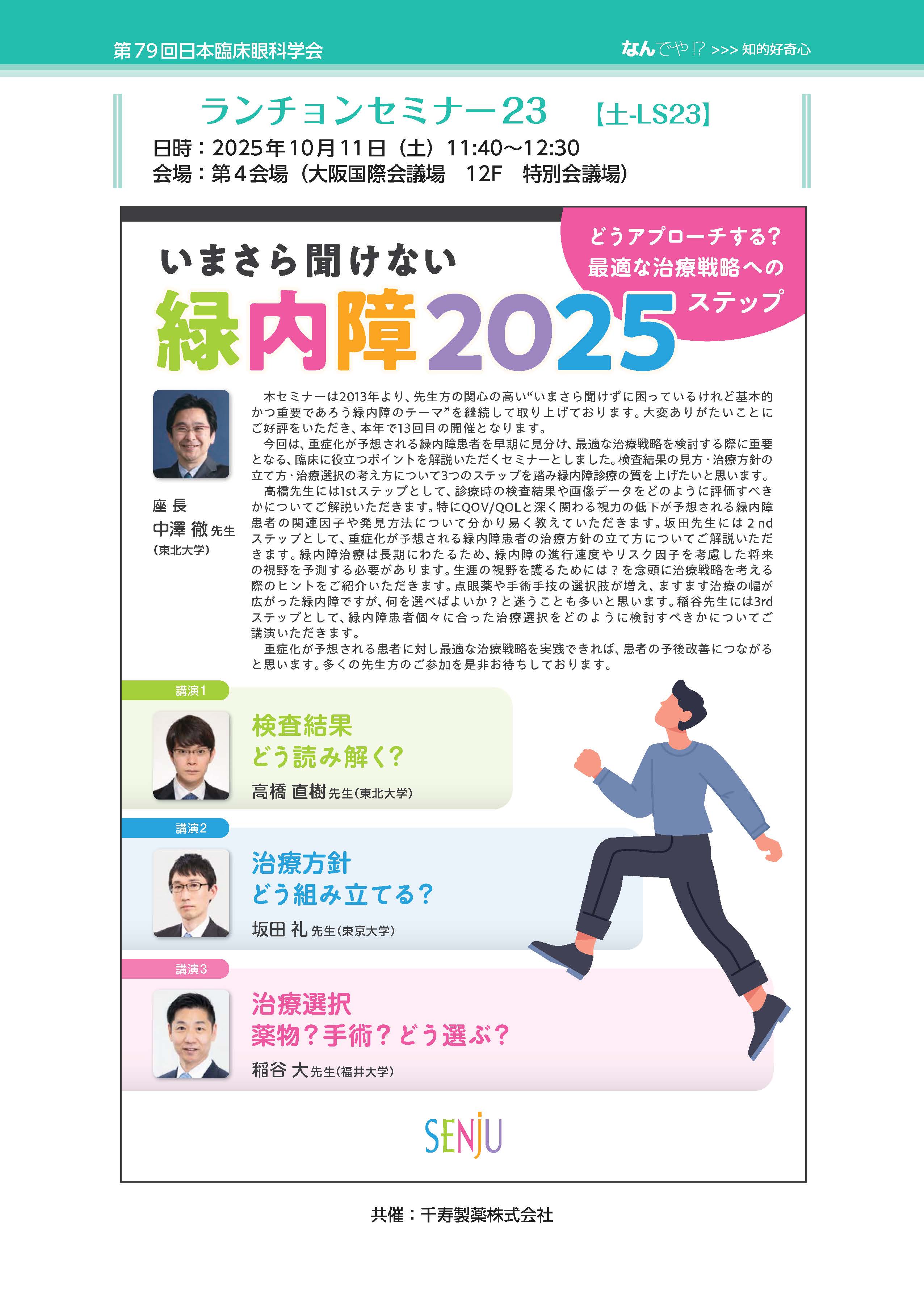 ランチョンセミナー 23 いまさら聞けない緑内障2025 どうアプローチする? 最適な治療戦略へのステップ 2025年10月11日(土) 11:40 - 12:30 第4会場 | 大阪国際会議場 12F 特別会議場 共催:千寿製薬株式会社 |