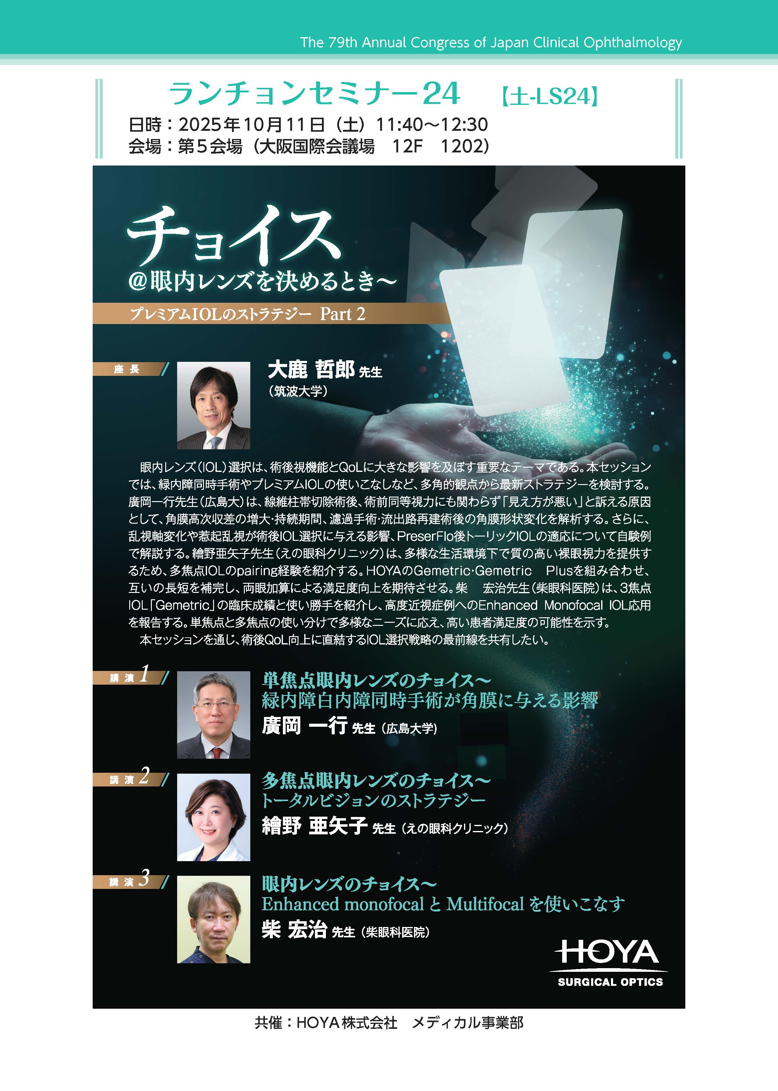 ランチョンセミナー 24 チョイス@眼内レンズを決めるとき~プレミアムIOLのストラテジーPart 2 2025年10月11日(土) 11:40 - 12:30 第5会場 | 大阪国際会議場 12F 1202 共催:HOYA株式会社 メディカル事業部 |
