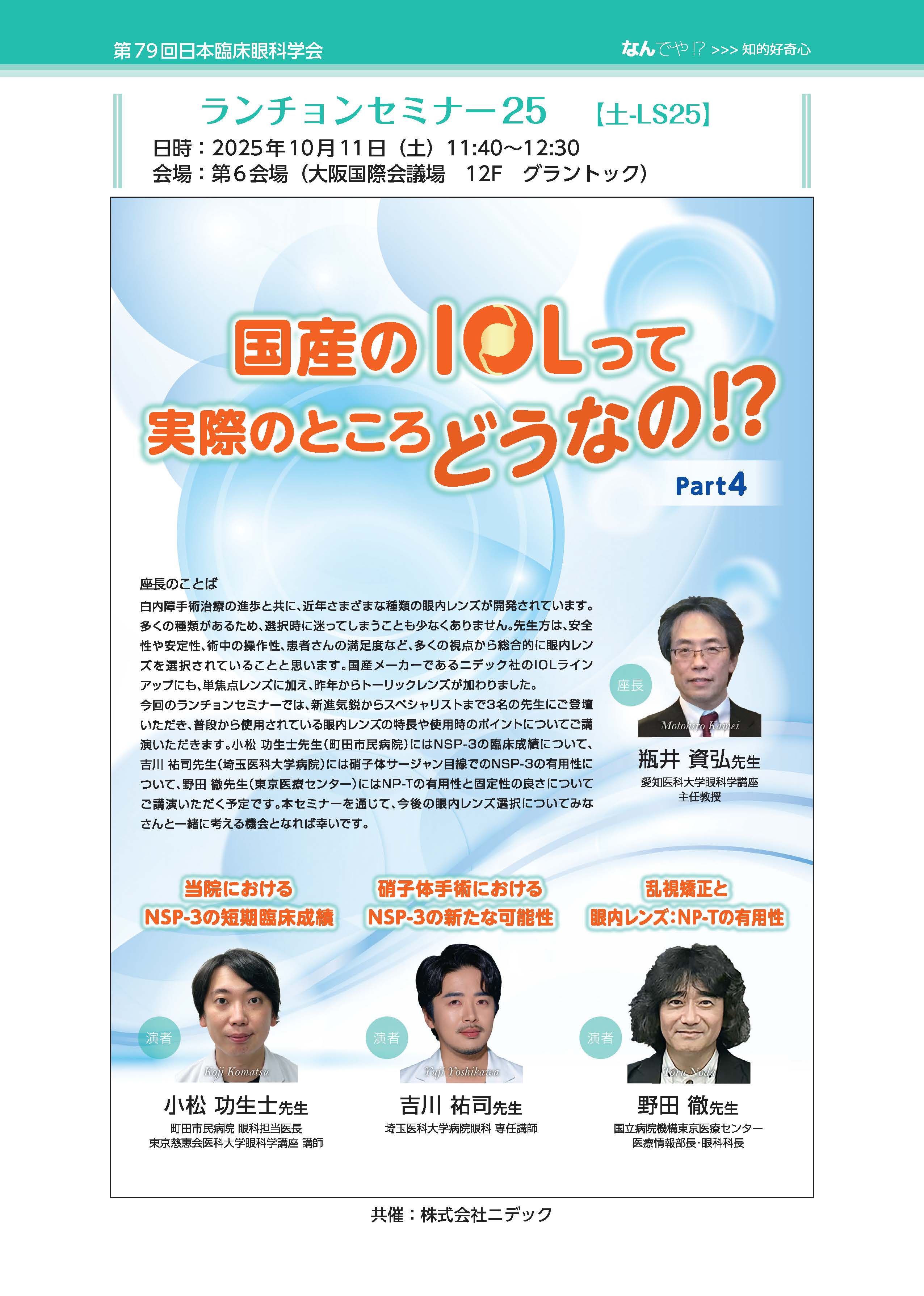 ランチョンセミナー 25 国産のIOLって実際のところどうなの!?Part4 2025年10月11日(土) 11:40 - 12:30 第6会場 | 大阪国際会議場 12F グラントック 共催:株式会社ニデック |