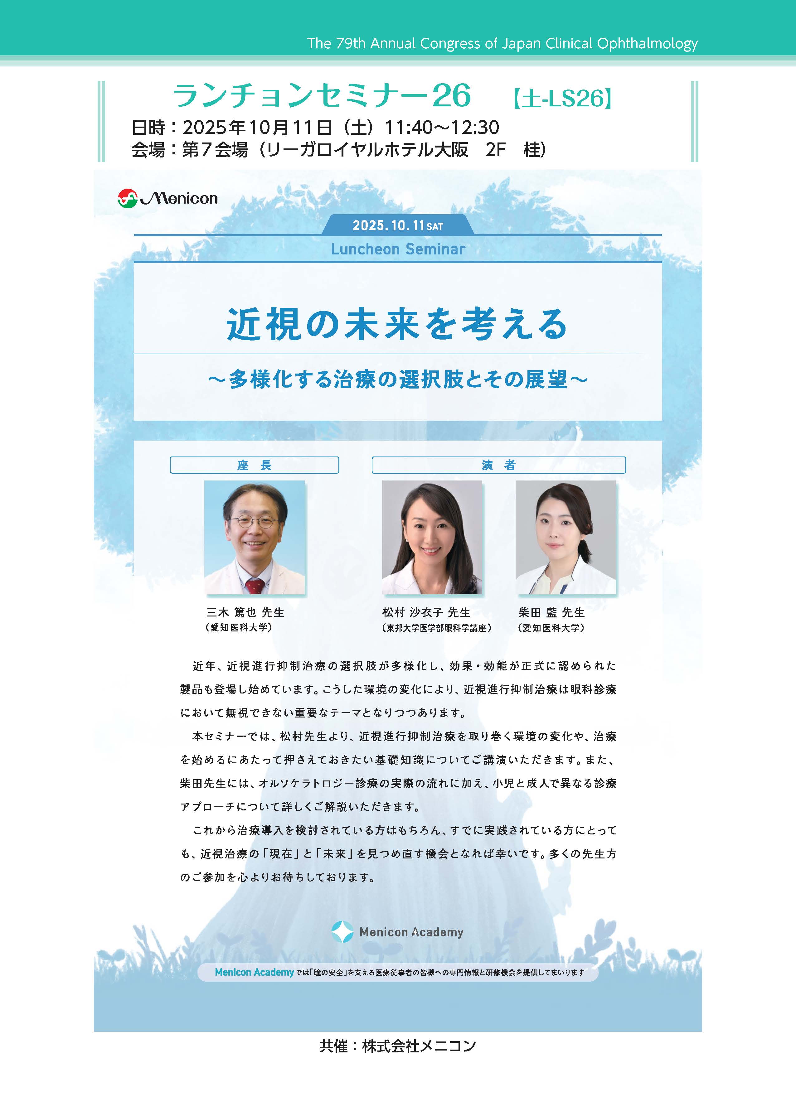 ランチョンセミナー 26 近視の未来を考える~多様化する治療の選択肢とその展望~ 2025年10月11日(土) 11:40 - 12:30 第7会場 | リーガロイヤルホテル大阪 2F 桂 共催:株式会社メニコン |
