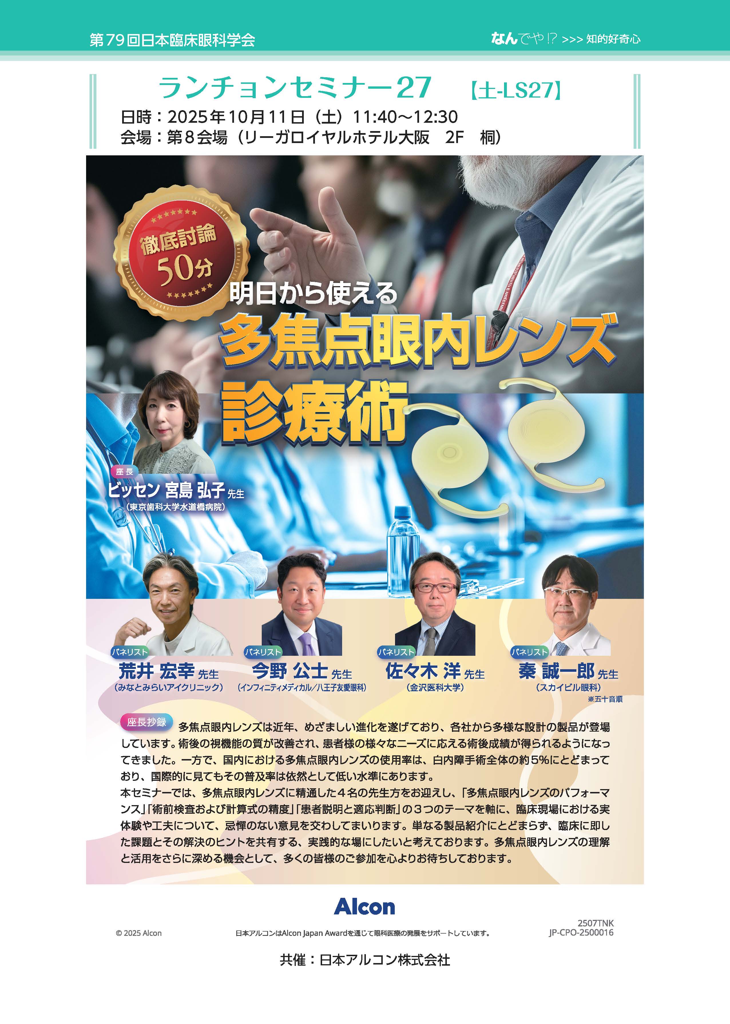 ランチョンセミナー 27 明日から使える多焦点眼内レンズ診療術~徹底討論50分~ 2025年10月11日(土) 11:40 - 12:30 第8会場 | リーガロイヤルホテル大阪 2F 桐 共催:日本アルコン株式会社 |
