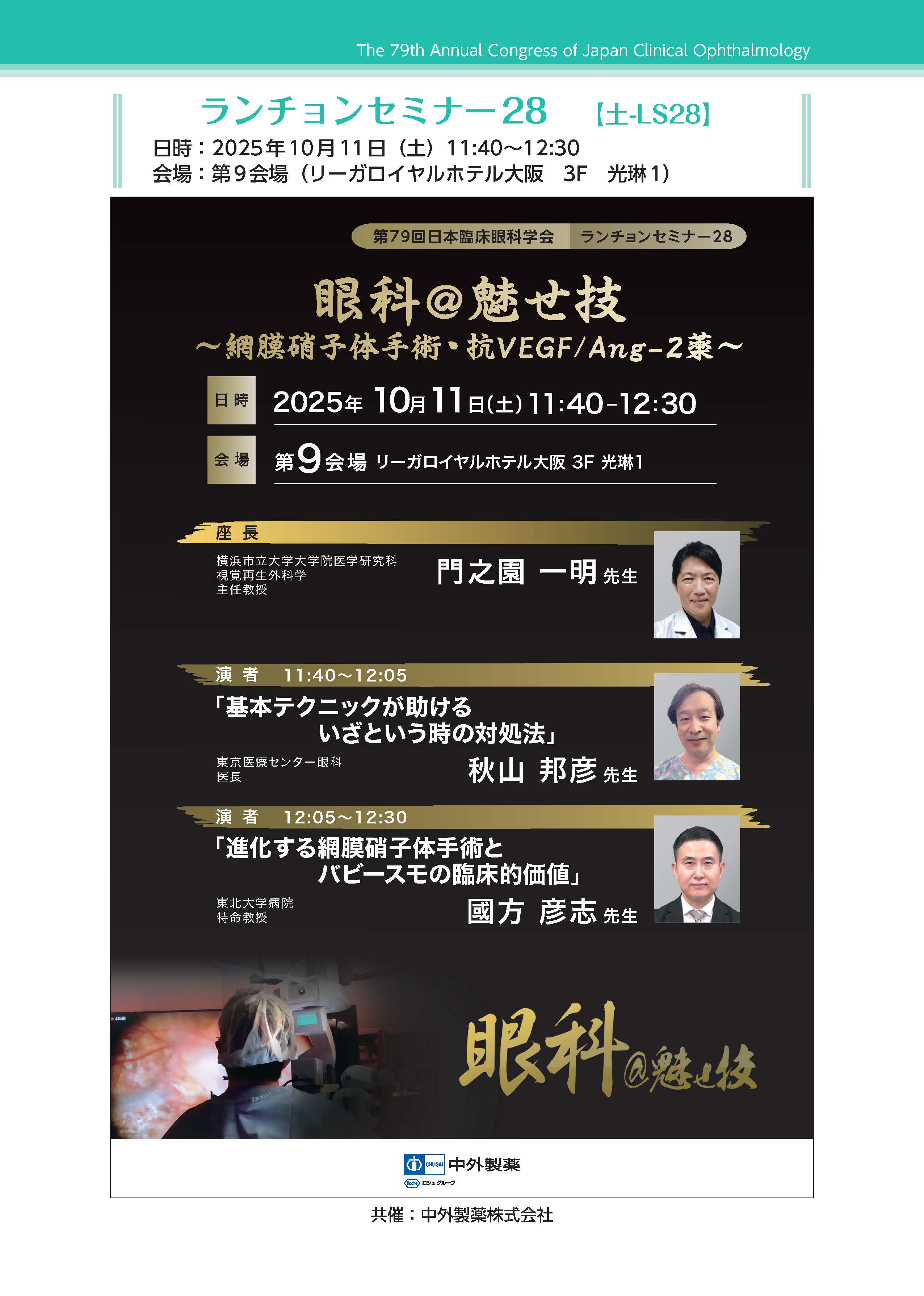 ランチョンセミナー 28 眼科@魅せ技 ~網膜硝子体手術・抗VEGF/Ang-2薬~ 2025年10月11日(土) 11:40 - 12:30 第9会場 | リーガロイヤルホテル大阪 3F 光琳1 共催:中外製薬株式会社 |