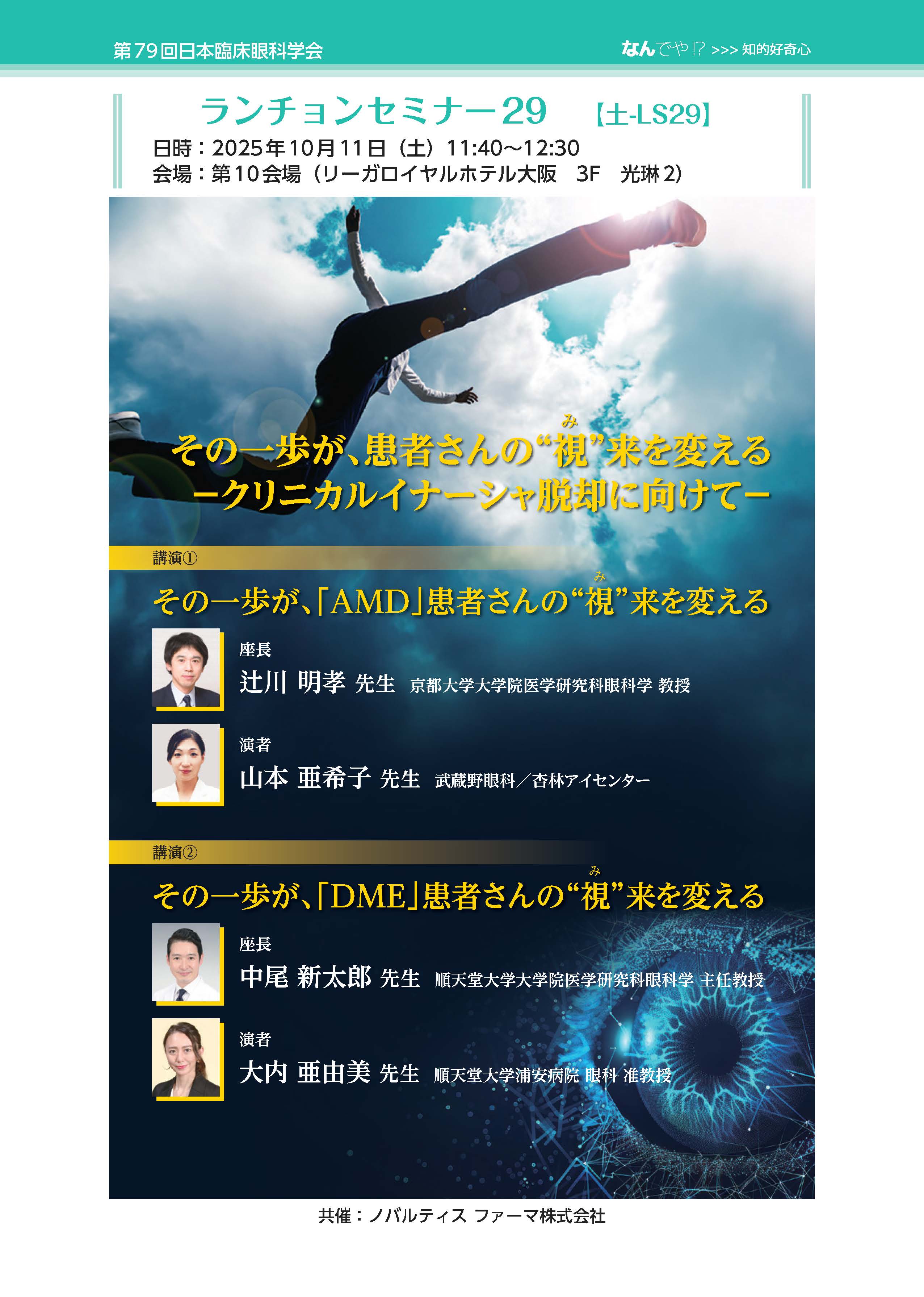 ランチョンセミナー 29 その一歩が、患者さんの”視”(み)来を変える -クリニカルイナーシャ脱却に向けて- 2025年10月11日(土) 11:40 - 12:30 第10会場 | リーガロイヤルホテル大阪 3F 光琳2 共催:ノバルティス ファーマ株式会社 メディカル・アフェアーズ本部 |