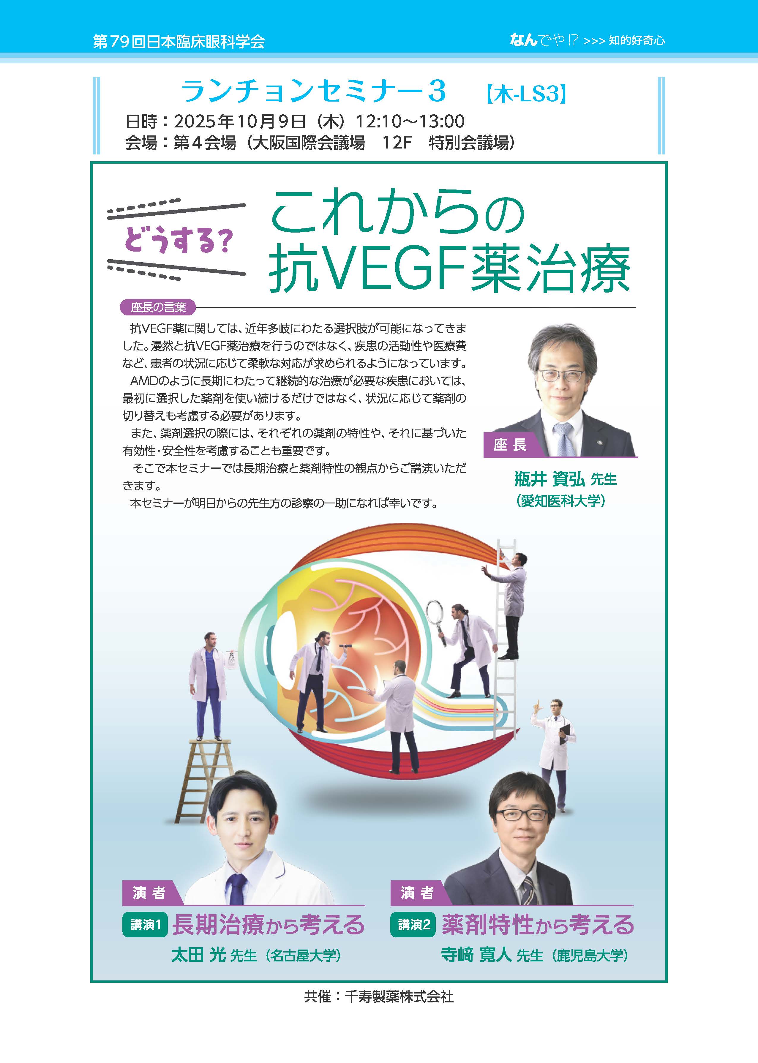 ランチョンセミナー 3 どうする?これからの抗VEGF薬治療 2025年10月9日(木) 12:10 - 13:00 第4会場 | 大阪国際会議場 12F 特別会議場 共催:千寿製薬株式会社 |
