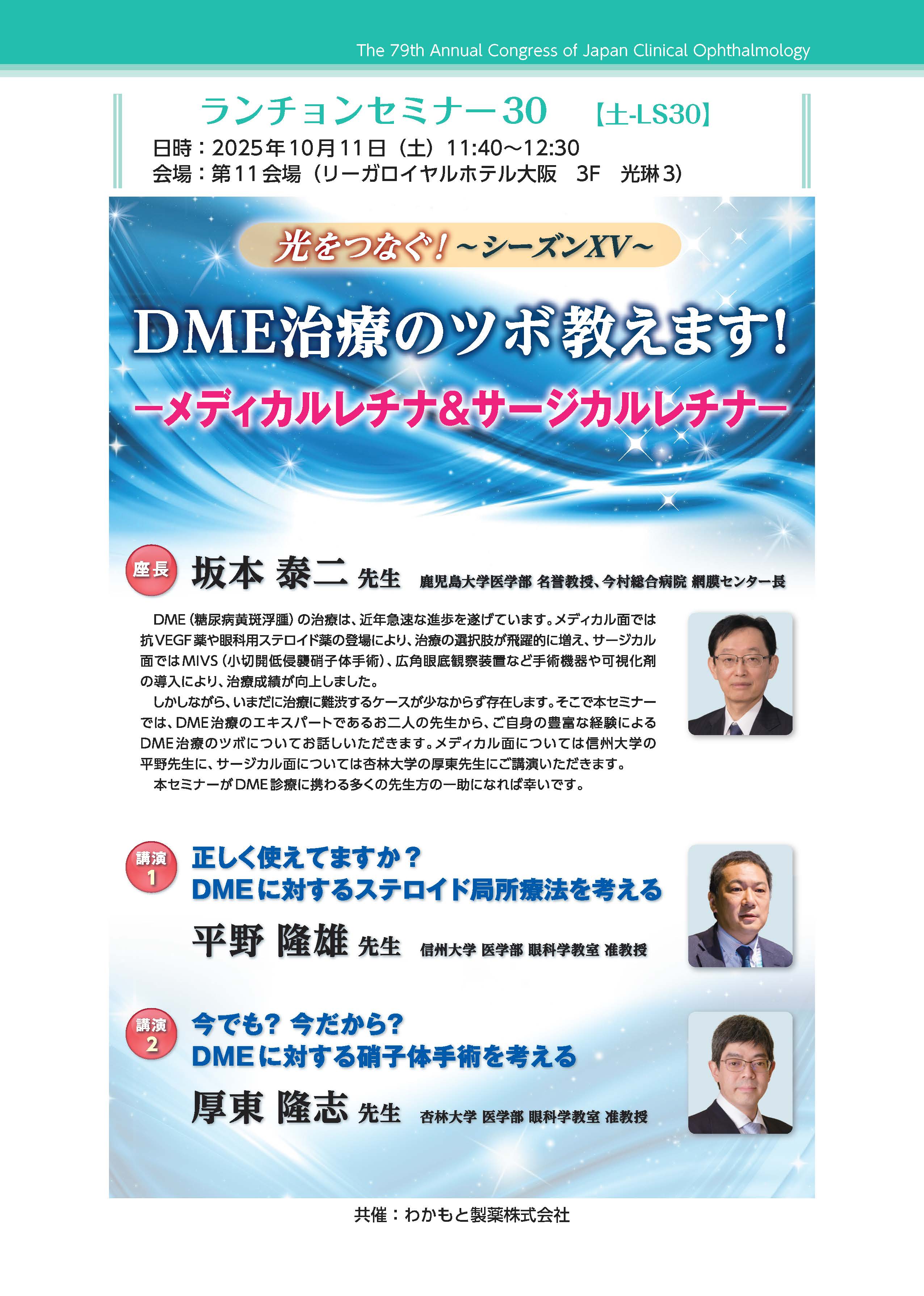 ランチョンセミナー 30 光をつなぐ!シーズンXV DME治療のツボ教えます! ―メディカルレチナ&サージカルレチナ― 2025年10月11日(土) 11:40 - 12:30 第11会場 | リーガロイヤルホテル大阪 3F 光琳3 共催:わかもと製薬株式会社 |