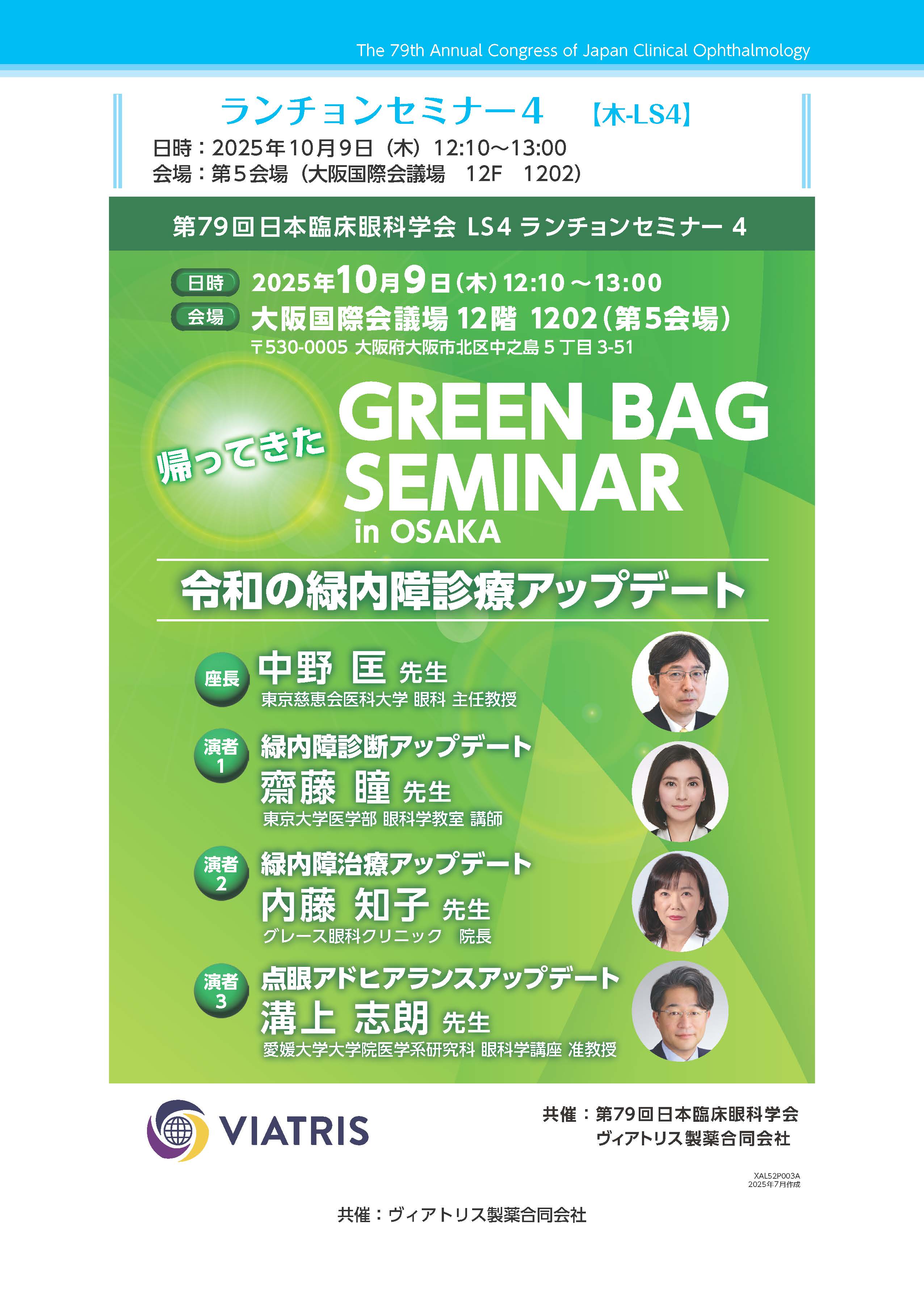 ランチョンセミナー 4 帰ってきたGREEN BAG SEMINAR in OSAKA 令和の緑内障診療アップデート 2025年10月9日(木) 12:10 - 13:00 第5会場 | 大阪国際会議場 12F 1202 共催:ヴィアトリス製薬合同会社 |
