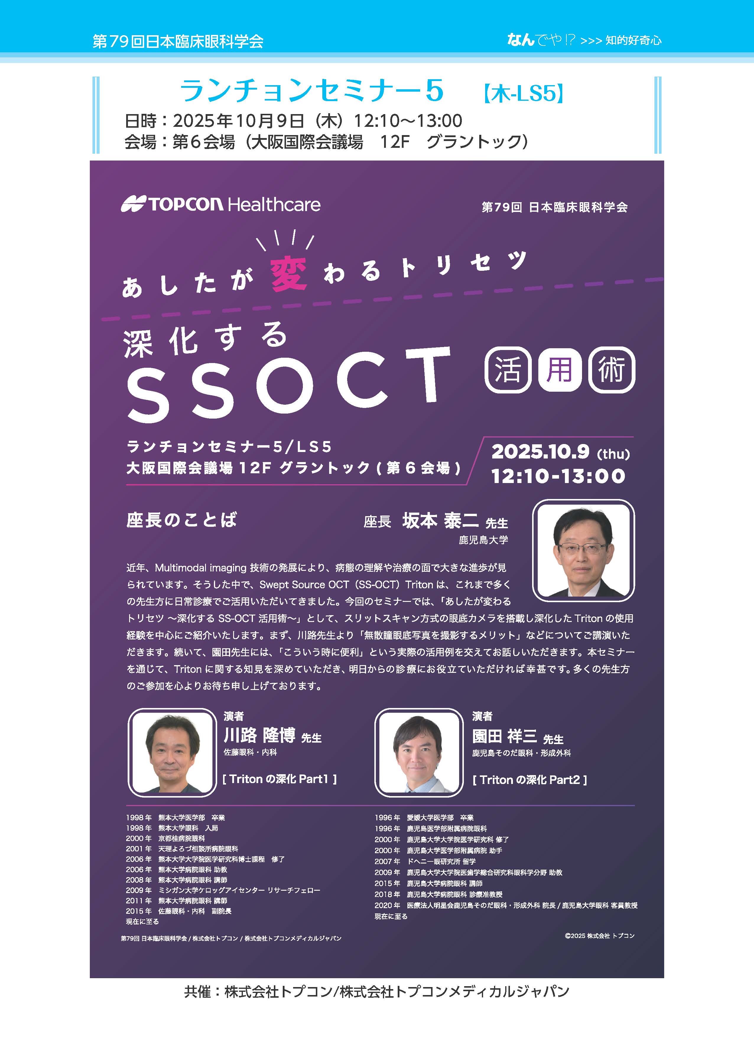 ランチョンセミナー 5 あしたが変わるトリセツ 深化するSSOCT活用術 2025年10月9日(木) 12:10 - 13:00 第6会場 | 大阪国際会議場 12F グラントック 共催:株式会社トプコン/株式会社トプコンメディカルジャパン |