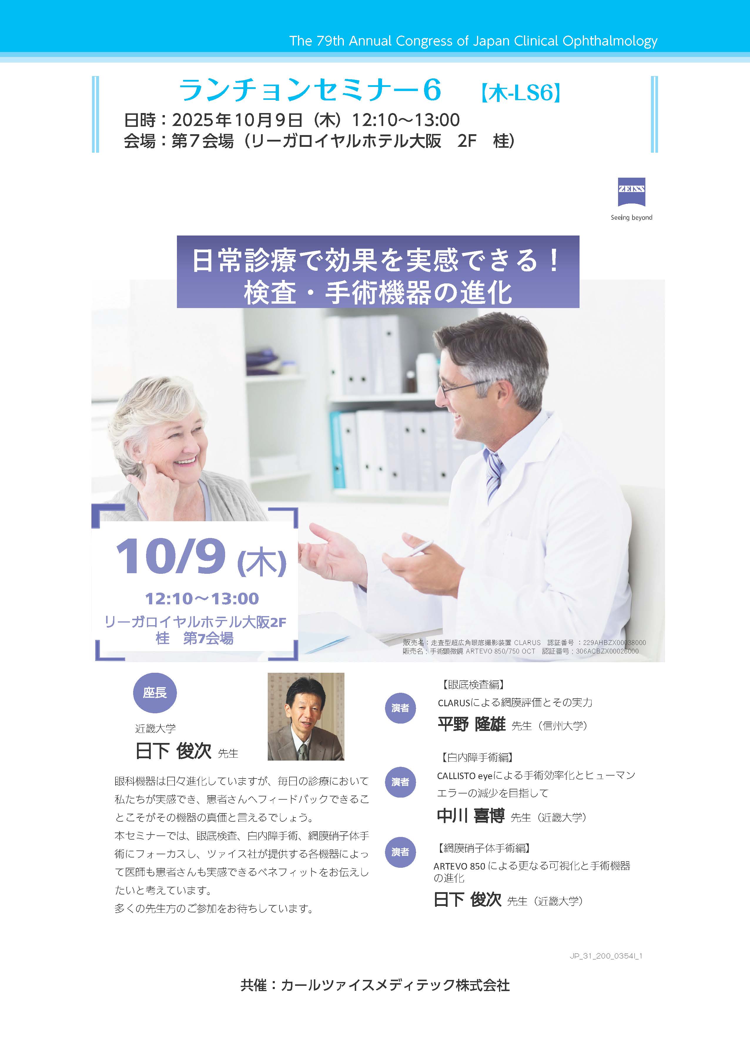 ランチョンセミナー 6 日常診療で効果を実感できる!検査・手術機器の進化 2025年10月9日(木) 12:10 - 13:00 第7会場 | リーガロイヤルホテル大阪 2F 桂 共催:カールツァイスメディテック株式会社 |