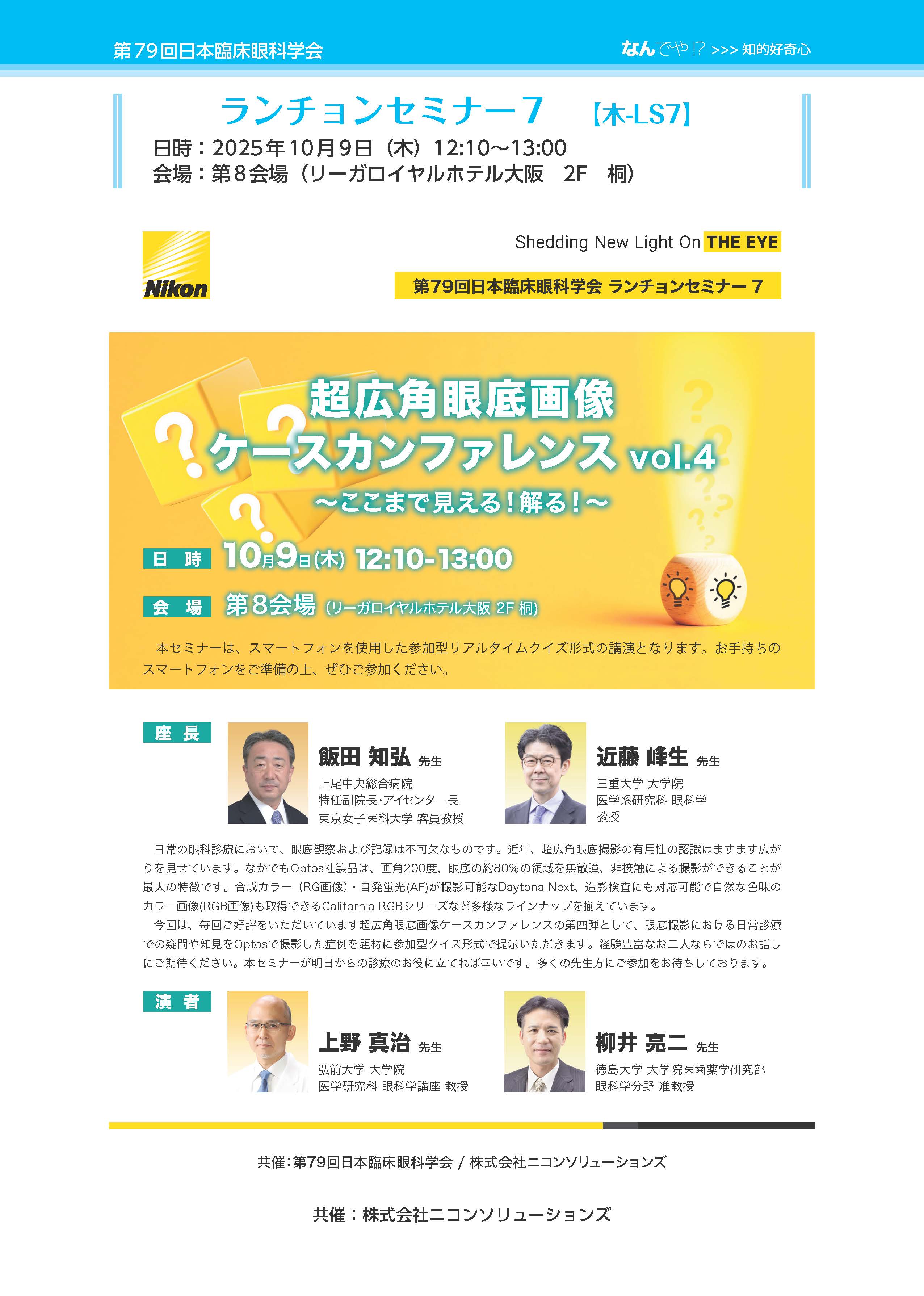 ランチョンセミナー 7 超広角眼底画像 ケースカンファレンス Vol.4 ~ここまで見える!解る!~ 2025年10月9日(木) 12:10 - 13:00 第8会場 | リーガロイヤルホテル大阪 2F 桐 共催:株式会社ニコンソリューションズ |