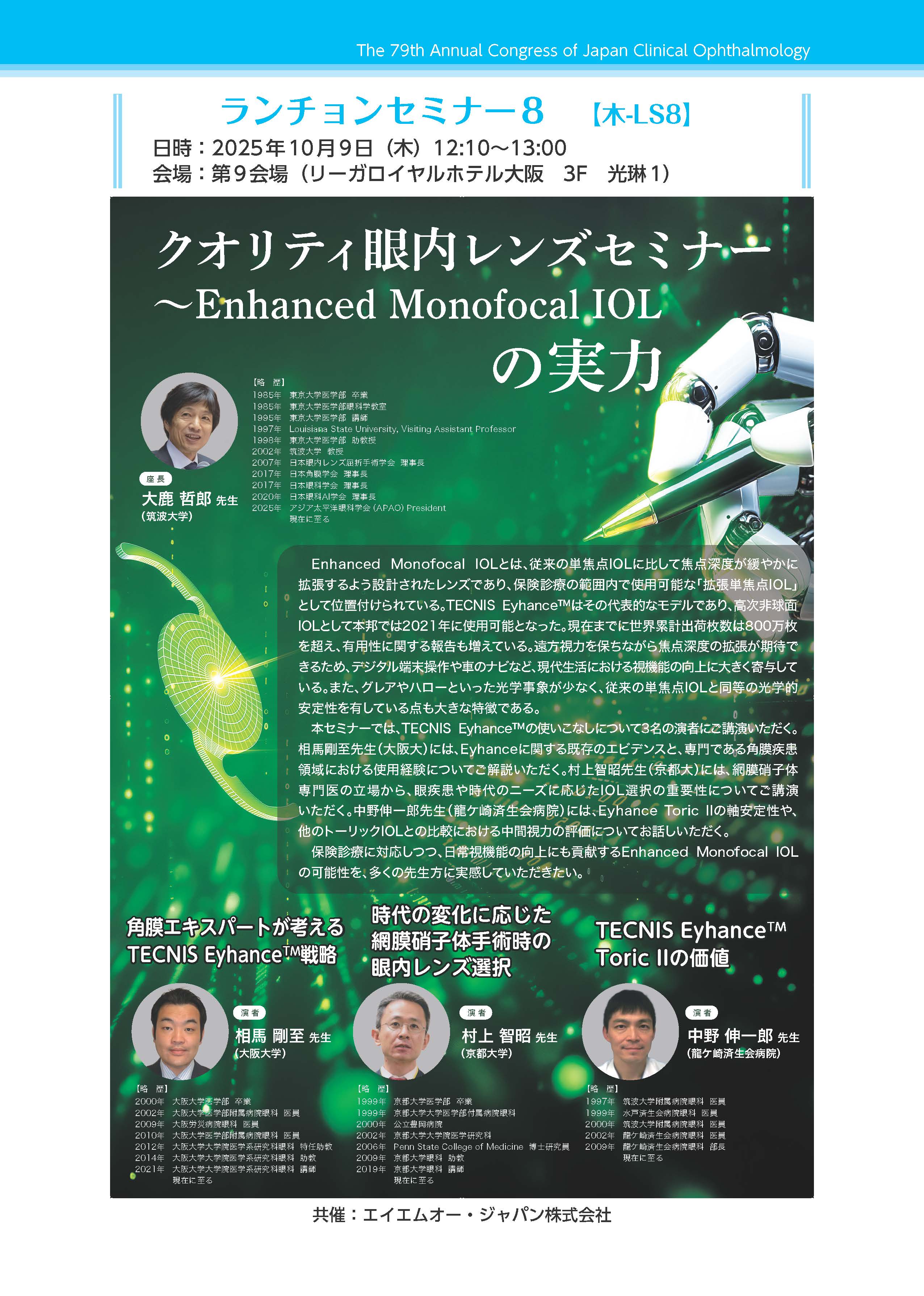 ランチョンセミナー 8 クオリティ眼内レンズセミナー ~Enhanced Monofocal IOLの実力 2025年10月9日(木) 12:10 - 13:00 第9会場 | リーガロイヤルホテル大阪 3F 光琳1 共催:エイエムオー・ジャパン株式会社 |