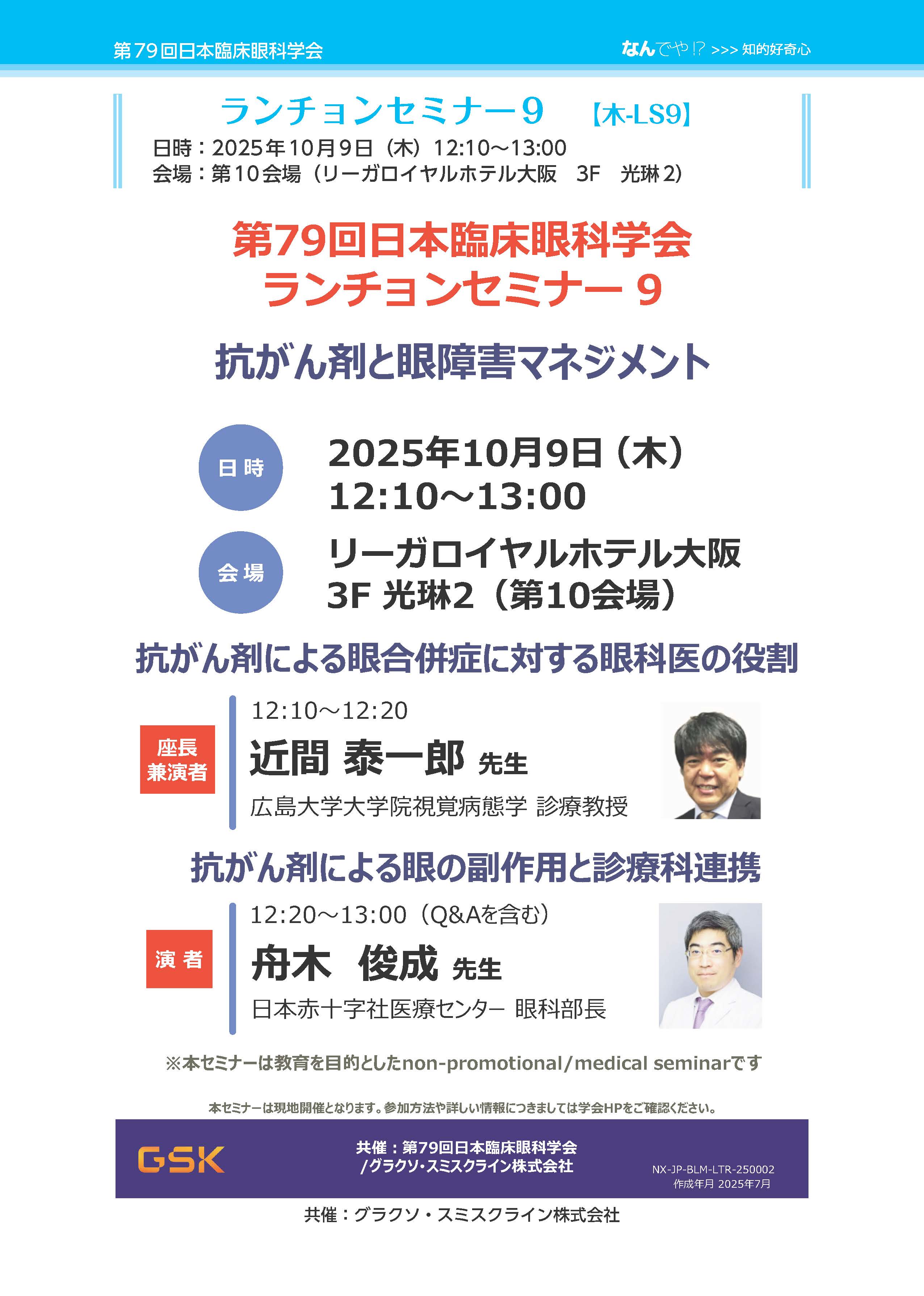 ランチョンセミナー 9 抗がん剤と眼障害マネジメント 2025年10月9日(木) 12:10 - 13:00 第10会場 | リーガロイヤルホテル大阪 3F 光琳2 共催:グラクソ・スミスクライン株式会社 |