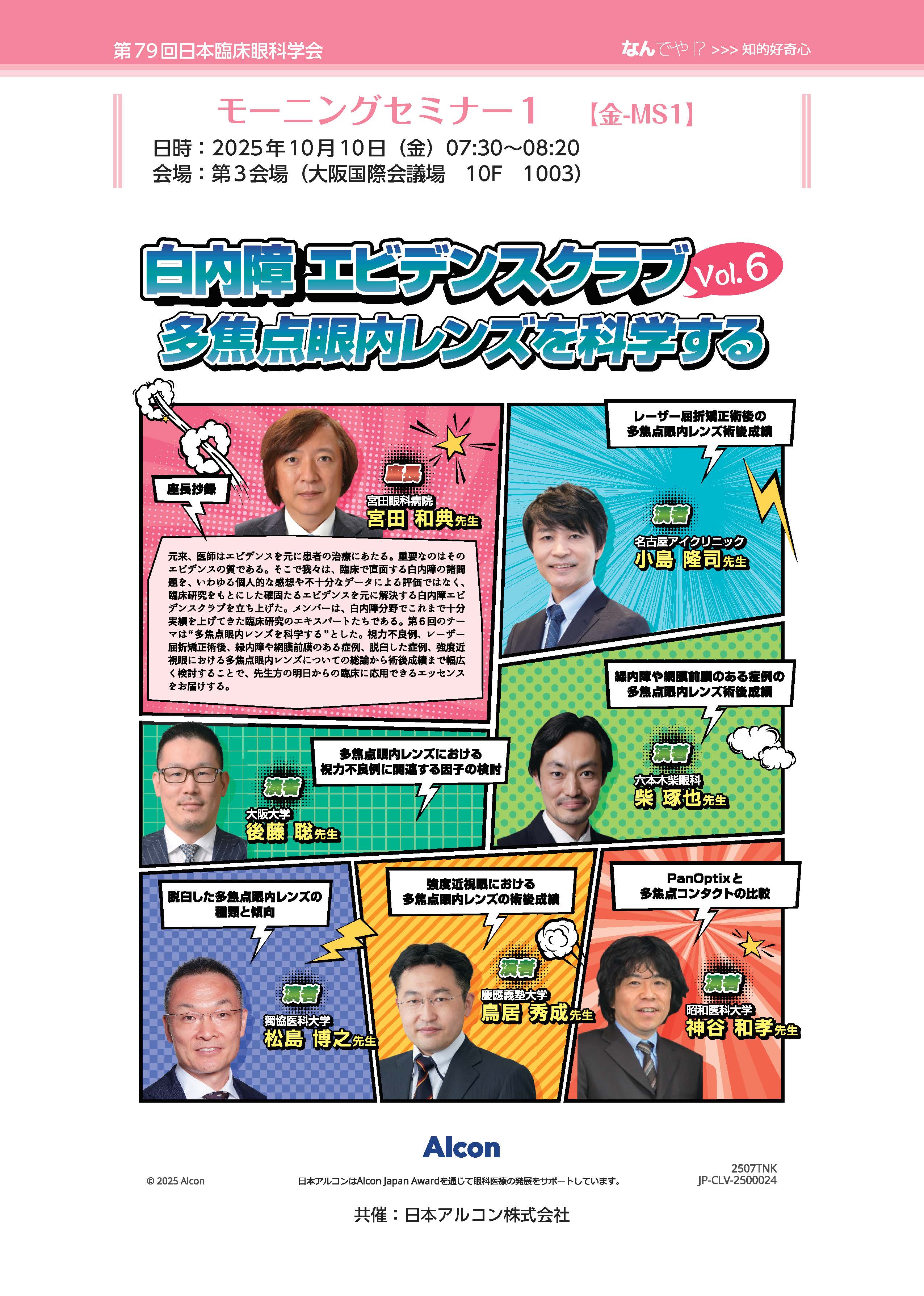 モーニングセミナー 1 白内障エビデンスクラブVol.6 多焦点眼内レンズを科学する 2025年10月10日(金) 7:30 - 8:20 第3会場 | 大阪国際会議場 10F 1003 共催:日本アルコン株式会社 |