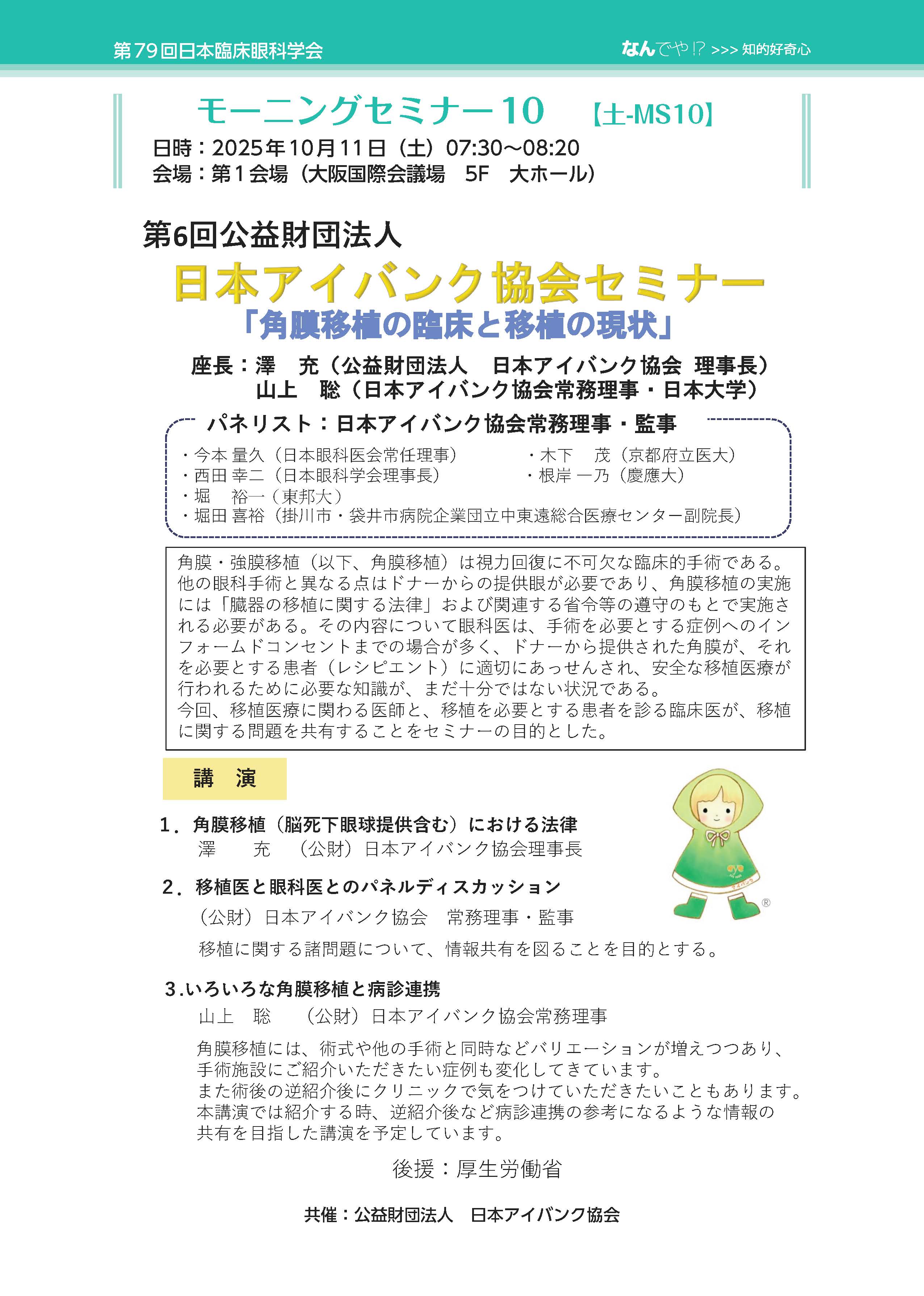 モーニングセミナー 10 角膜移植の臨床と移植の現状 2025年10月11日(土) 7:30 - 8:20 第1会場 | 大阪国際会議場 5F 大ホール 共催:公益財団法人 日本アイバンク協会 |